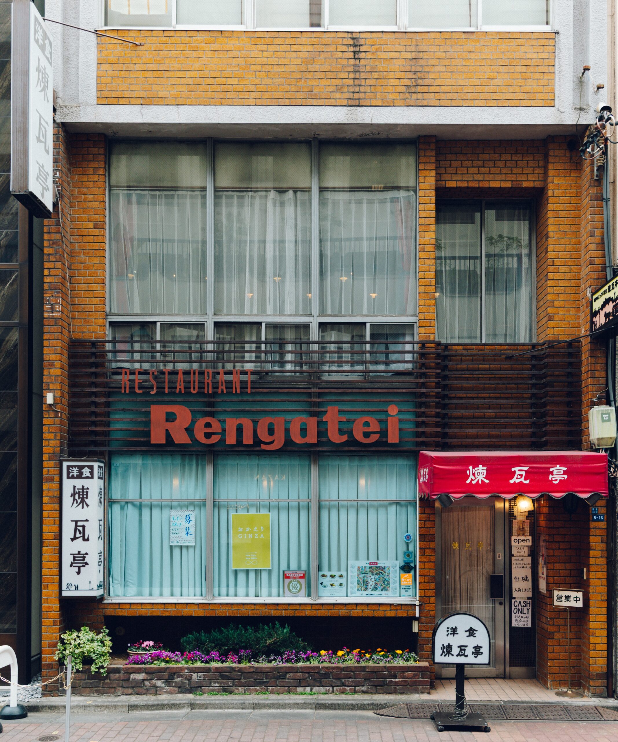 銀座のガス灯通り沿いにある『煉瓦亭』。趣のあるレトロな外観が目印です。お店があるのは明治時代にあった銀座煉瓦街の跡地でもあり、当時のレンガが工事現場から発見され、それを外観に使用しています。