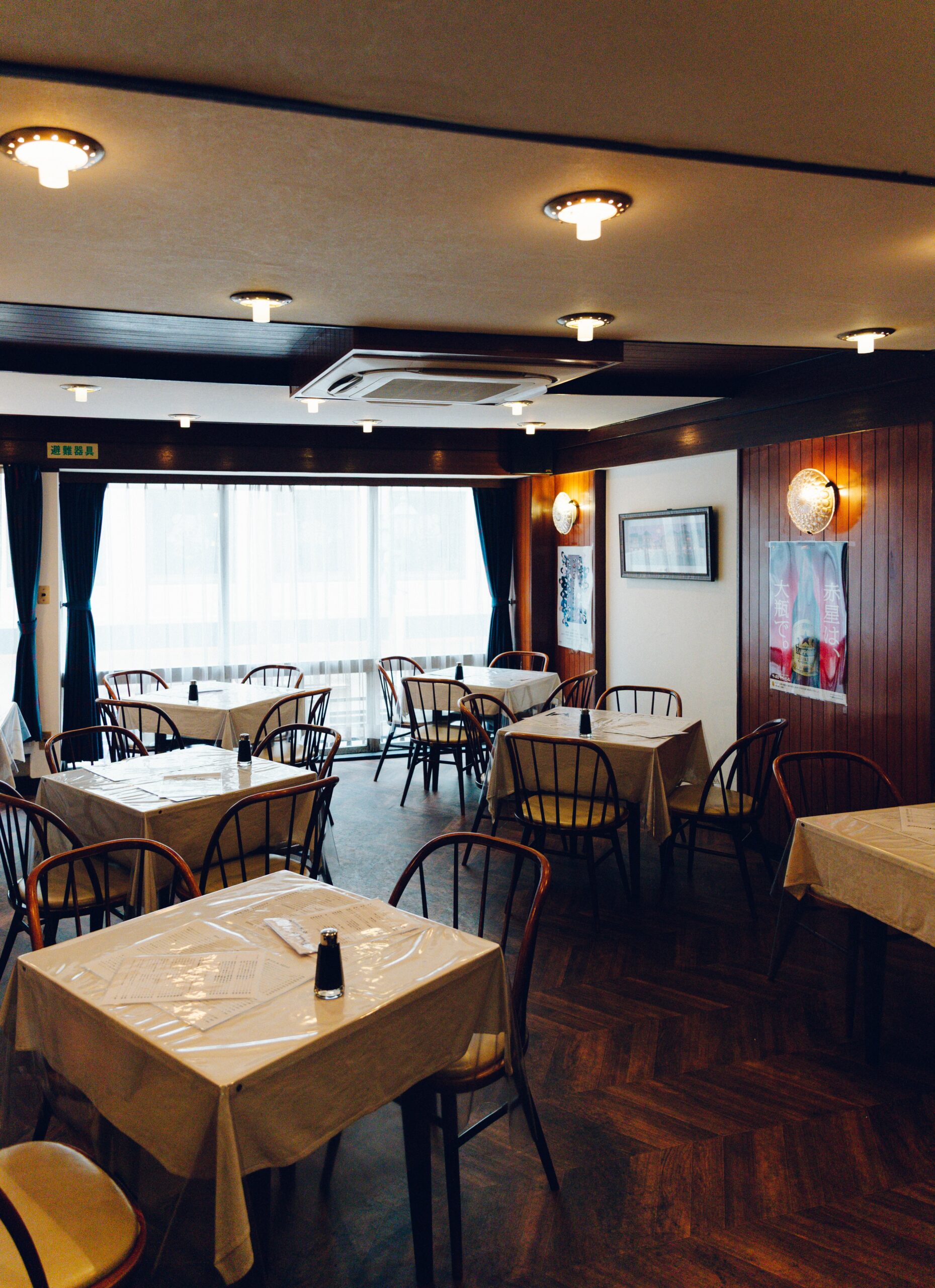 お店は、1階から3階まで3つのフロアで構成されています。1、2階にはビニールのテーブルクロスがモダンな雰囲気を醸すテーブル席。3階には座敷席も用意されています。1階に飾られている『煉瓦亭』を描いた絵は画家、絵本作家の堀川理万子さんによるもの。堀川理万子さんは、4代目店主 木田浩一朗さんの同級生という繋がりがあり、絵の中にも木田さんがお客さんを迎える様子が描かれています。