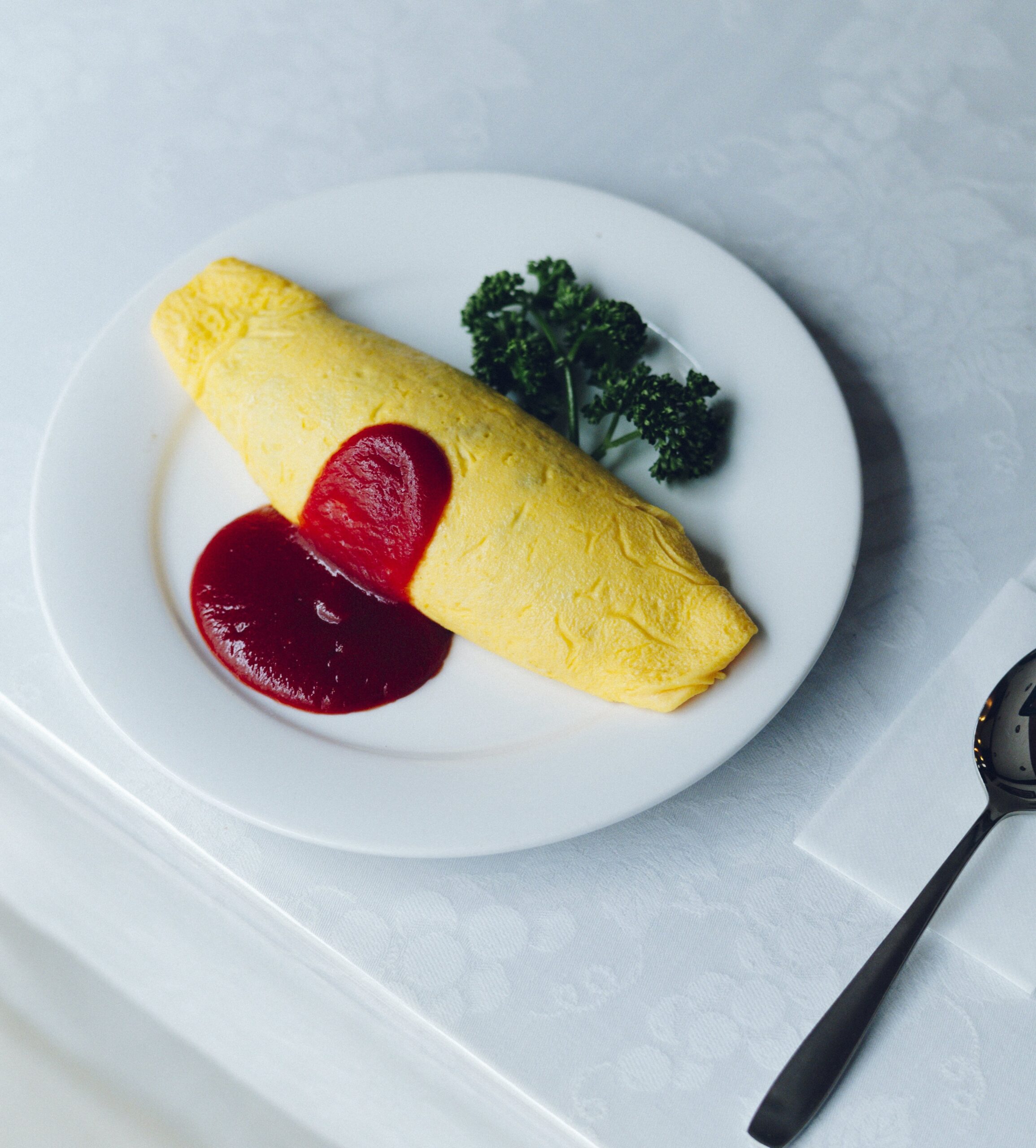 玉子をたっぷりと使いソフトに焼き上げ、さくっとスプーンが入るように作られた煉瓦亭オリジナルのオムライス。明治誕生オムライス 2,800円