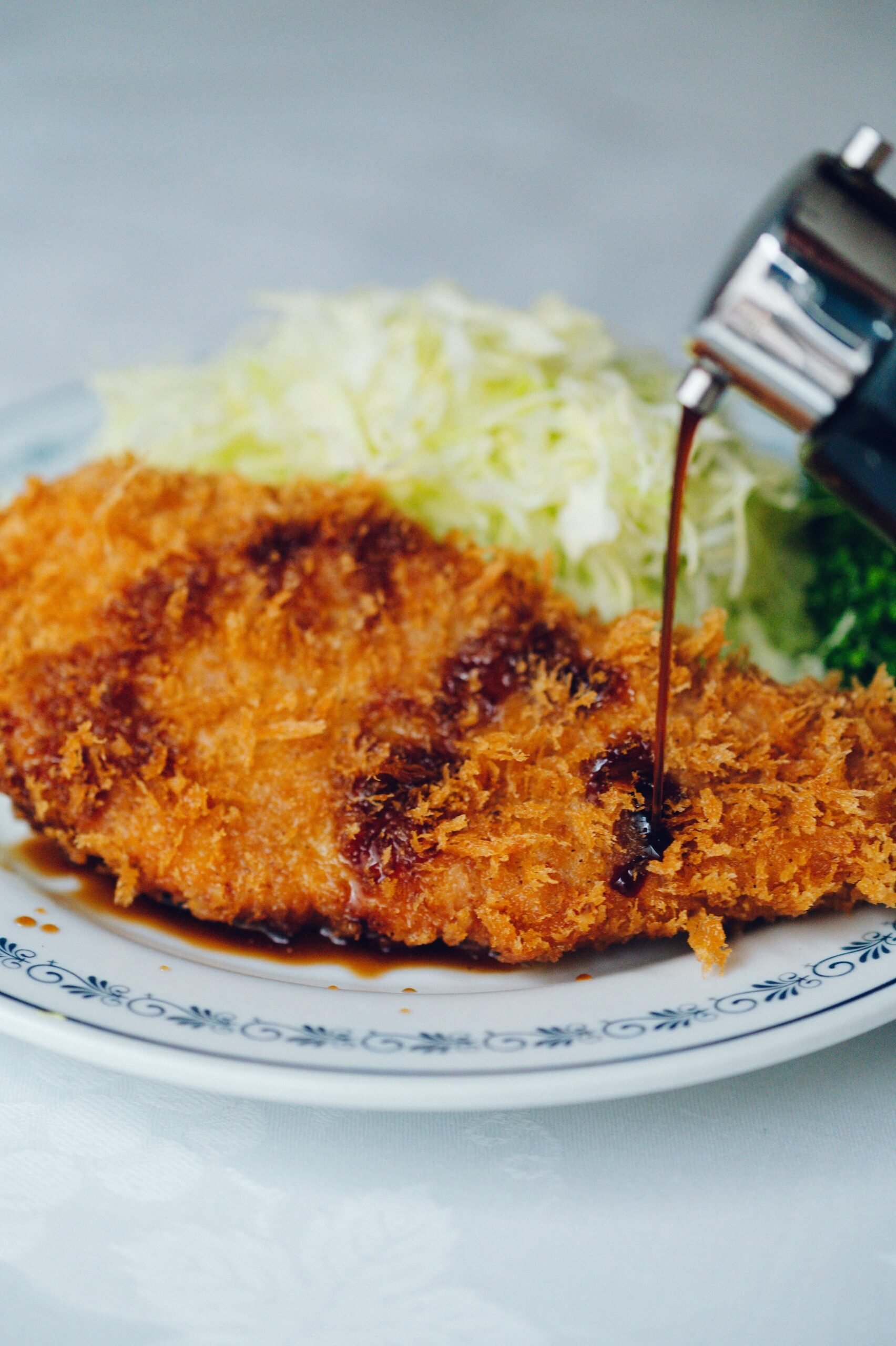 ポークカツレツと千切りきゃべつも、かけているソースも、ここに映っている全部が『煉瓦亭』発祥のもの! ポークカツレツにソースを少しだけかけてサッといただくとサクサクの食感とジューシーなお肉のコントラストを楽しめます。