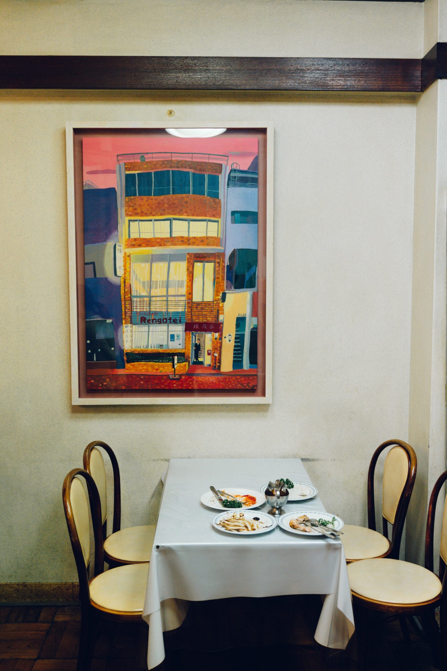 1階フロアにあるテーブル席。飾られている絵は、4代目店主 木田浩一朗さんの友人でもある画家、絵本作家の堀川理万子さんが『煉瓦亭』のために描き下ろした作品。お店の外観が可愛く描かれています。