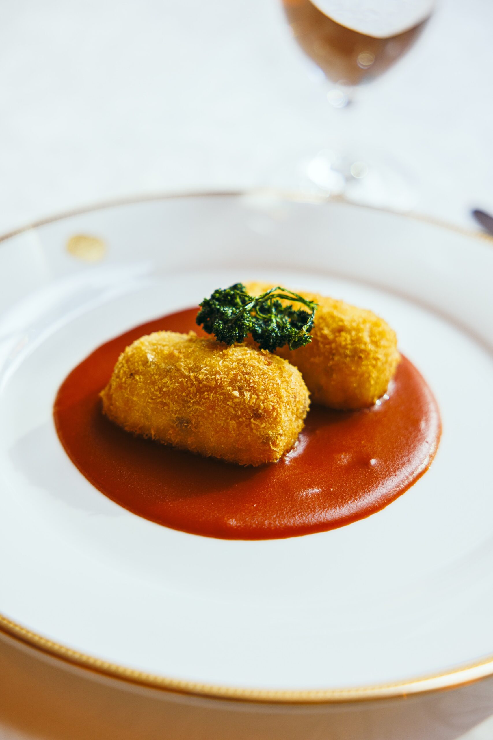 1931年に誕生した看板メニューのひとつ。ハムと仔牛肩肉の旨みと野菜の甘みが詰まったベシャメルソースを、きめ細かな衣で包んでカラッと揚げた一皿。ミートクロケット 3,100円