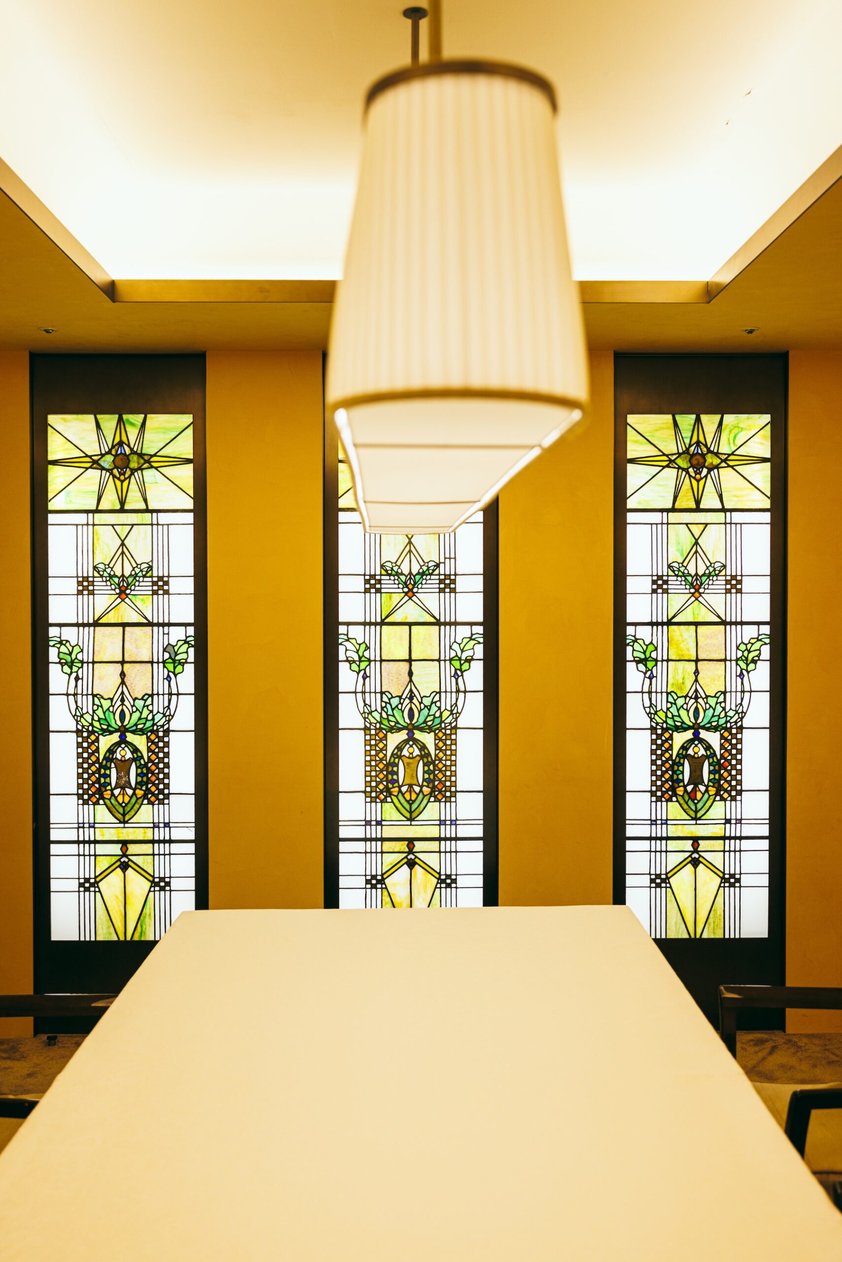店内は、美術館に迷い込んだかのような優雅な世界。吹き抜け天井のある空間は、木造2階建てだった当時の店舗の建築をイメージした造りで、開放感と歴史的な重厚感が共存しています。照明器具も当時の意匠をアレンジしたもので、光の陰影にまで美意識が行き届いています。個室に設えられたステンドグラスは、1928年に建てられた資生堂化粧品店の建物の窓に使用されていたもの。