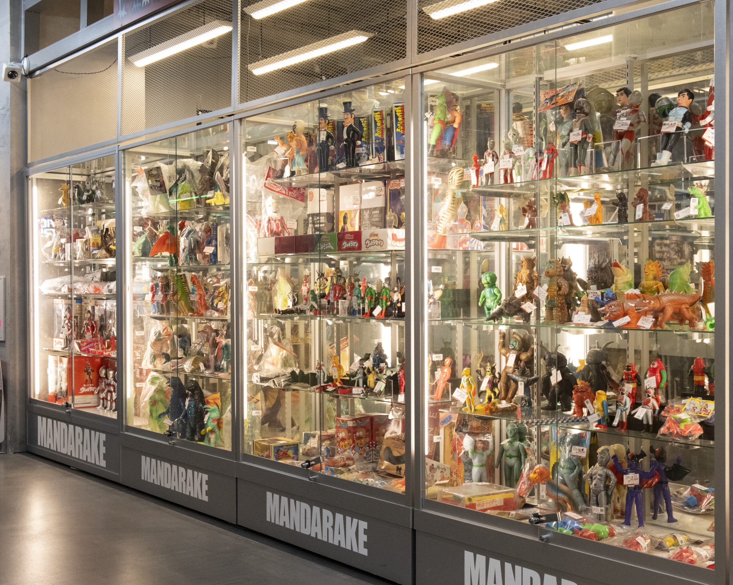 そんなソフビ文化の最前線に触れることができるのが、東京の秋葉原にある『まんだらけCoCoo』。日本最大級のソフビ専門店として、世界中からソフビ好きが集まるこの店は、さながらソフビの博物館です。広い店内には、インディーズからヴィンテージまで、数々のソフビがジャンルごとにガラスケースの中に整然と並べられています。