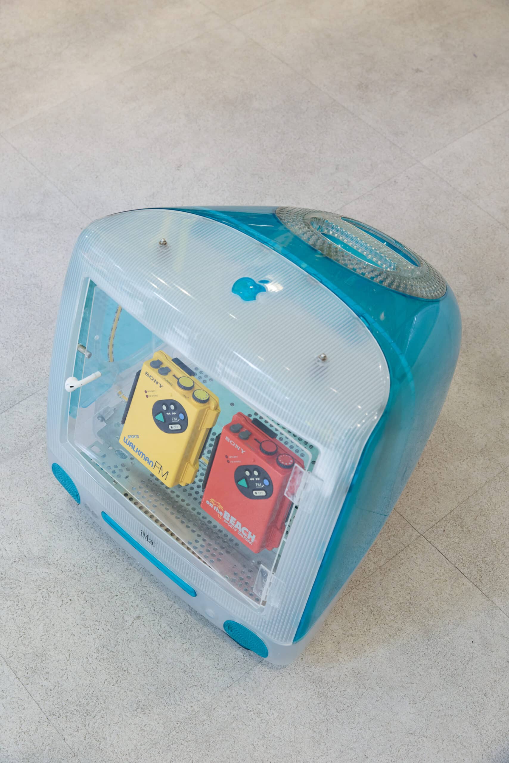 「1990年代後半に登場し大きな話題を呼んだ初代『iMac』は、パソコンとして使える代物ではないですけど、このデザインは今見てもカッコいいですよね。それならばインテリアとして使えたらいいんじゃないかと、ディスプレイにカスタマイズしました。他にも“ソニースポーツ”からリリースされていた水中カメラをスピーカーにしてみたりもしています」。