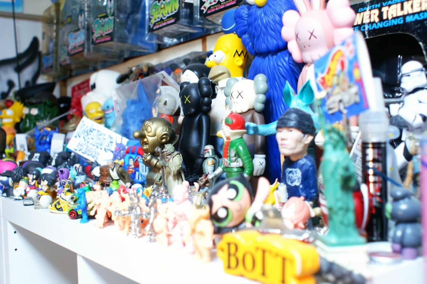 アトリエ内にはフィギュアがたくさんディスプレイされている。現在もカルト的な人気を誇るアメコミ『スポーン』のフィギュア群。「ダークヒーロー感やロゴ、パッケージの雰囲気がたまらなく好きですね。『スターウォーズ』も当然好きです」。
