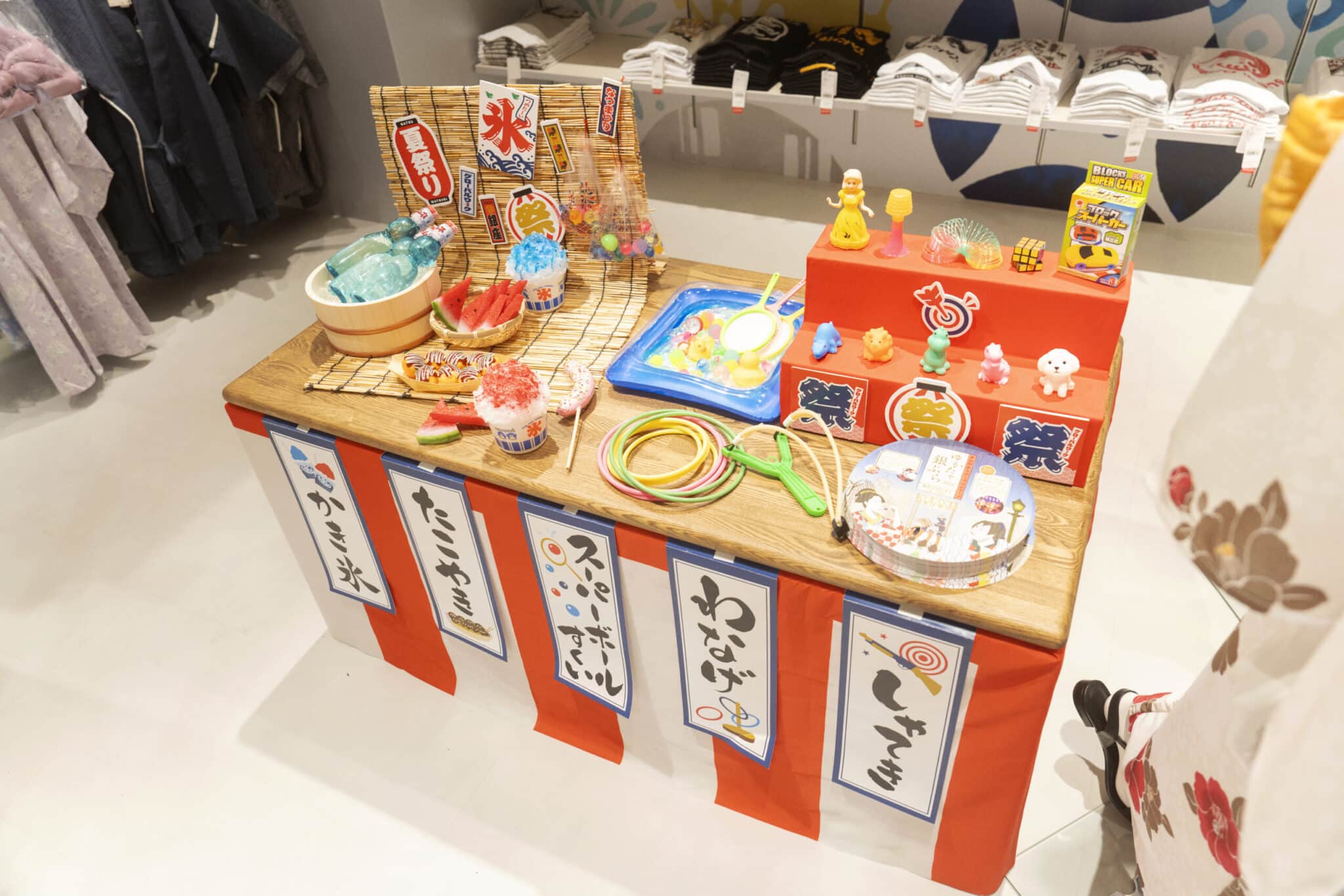 Upon entering the store, you will find the corner transforms into a complete ennichi (festival fair) setting. Traditional fair attractions spread before you: target shooting, Super Ball scooping, takoyaki (octopus balls), kakigōri (shaved ice), chocolate bananas—all the familiar sights of a Japanese ennichi. For Japanese visitors, it evokes nostalgic warmth, while international guests find it amazingly fresh and exciting. The fact that non-merchandise items are "displayed" at the center of the space demonstrates how much this corner prioritizes "experience."