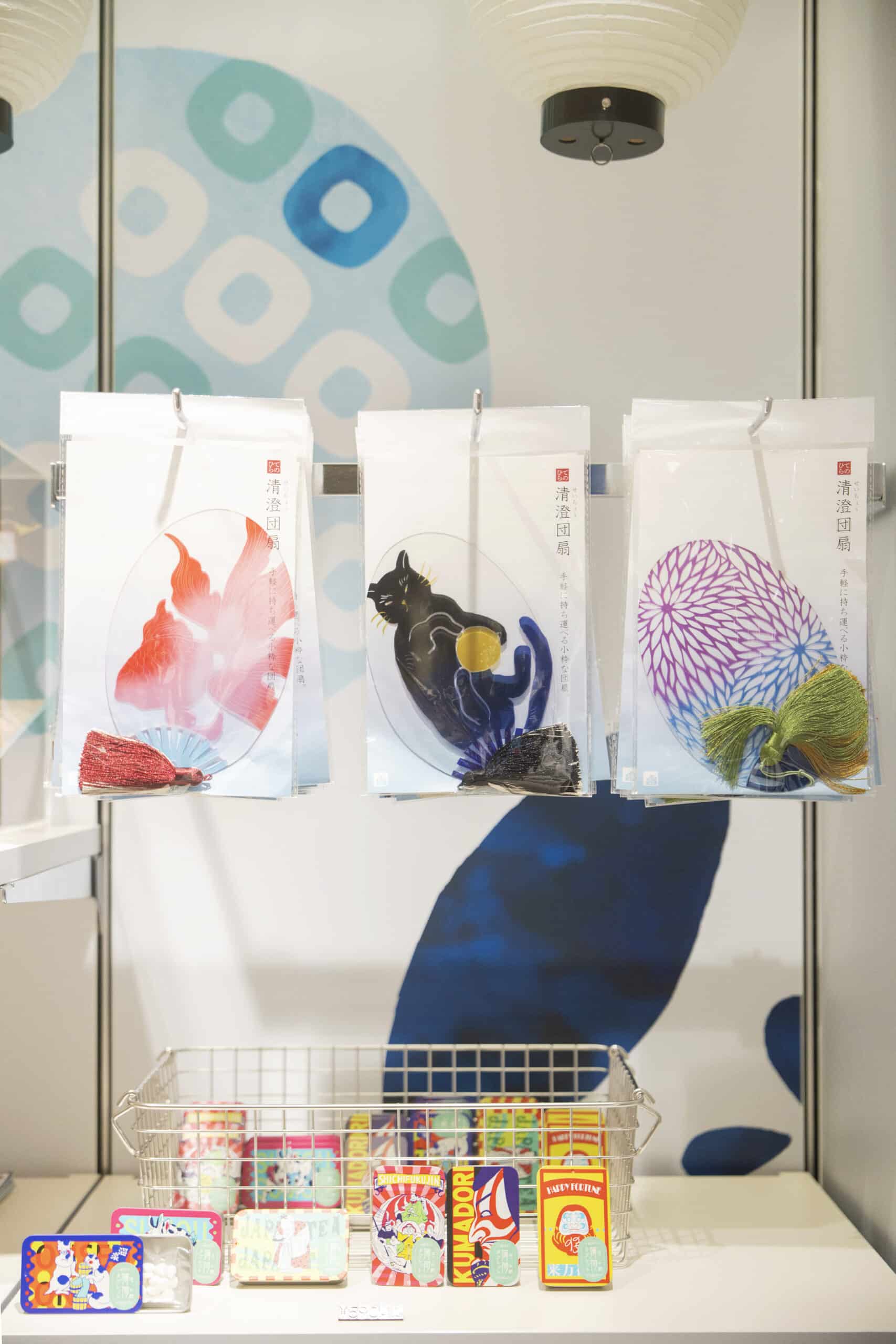 Japanese-style accessories are well-stocked. Mini uchiwa at ¥1,190 each (tax included), Frisk cases at ¥590 each (tax included).