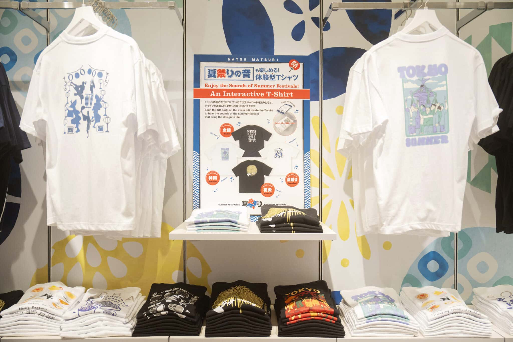 Most innovative are the "experiential T-shirts" that produce natsu matsuri sounds. By scanning the QR code on the tag, you hear sounds that correspond to the T-shirt's design. Don-don (taiko drums), pee-hyara (kagura festival music), wasshoi (festival chants), whoo (hanabi fireworks). These garments let you wear, see, style, and "enjoy through sound"—a surprise item that engages all your senses.