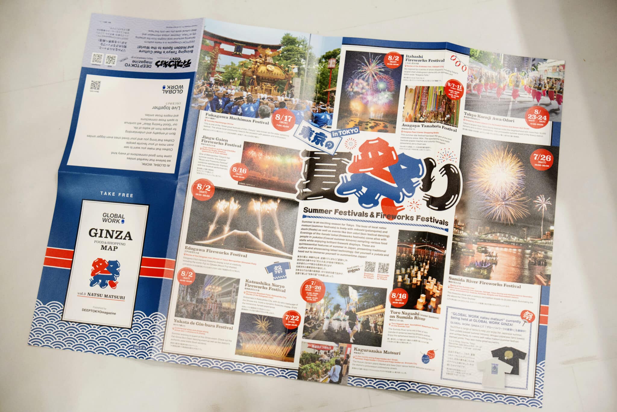Since the Ginza store's opening, the ongoing collaboration between GLOBAL WORK GINZA and DEEPTOKYO magazine has produced the 'GINZA MAP,' distributed free to customers in limited quantities. Each issue features content aligned with the Japan Content Corner's theme. This VOL.4 "natsu matsuri" edition showcases Tokyo's natsu matsuri and hanabi taikai on the front, with an illustrated map of Ginza's renowned establishments on the back.