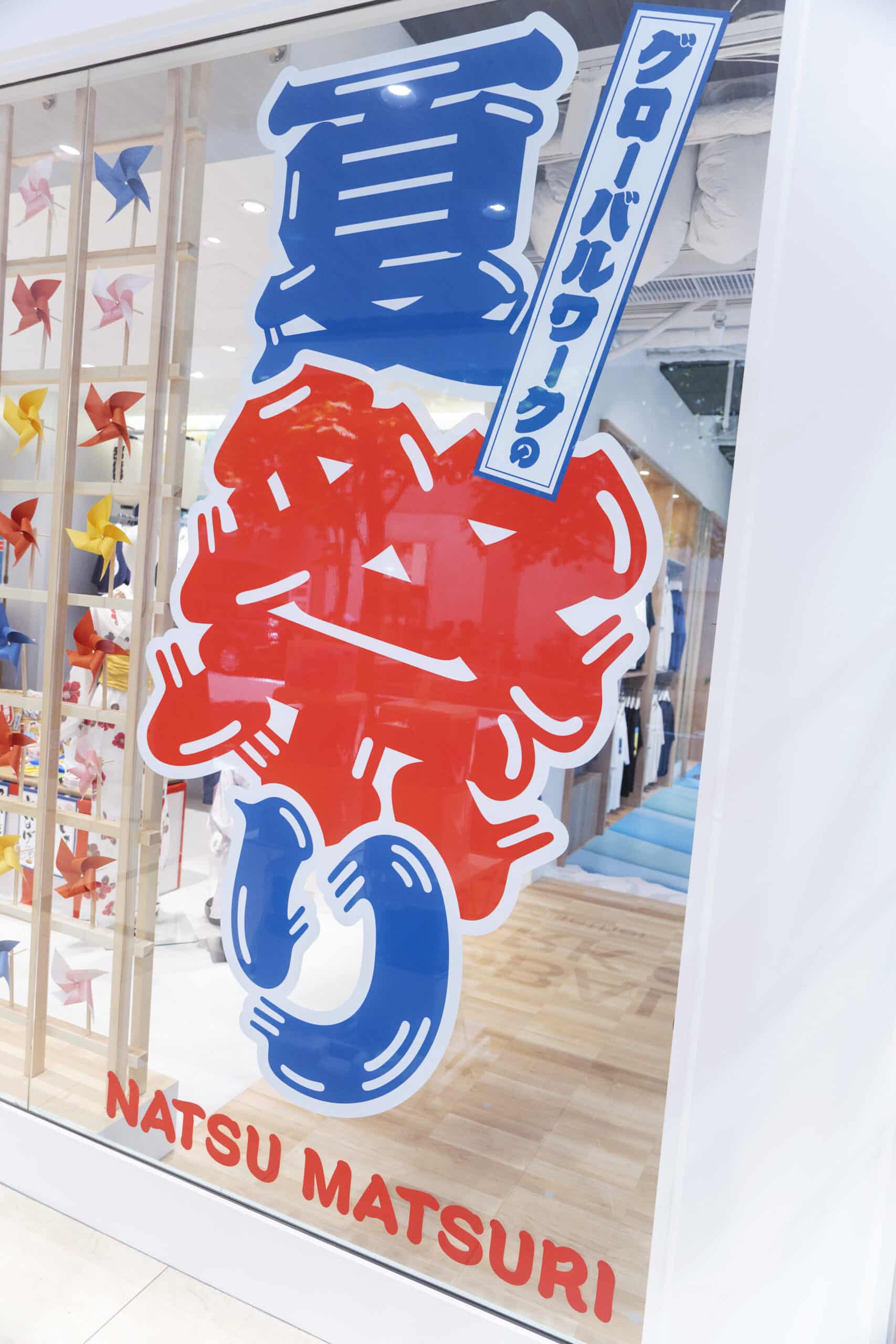Since July, the theme has been natsu matsuri (summer festivals)v. The entire corner radiates a festival atmosphere. First, the window facing Marronnier Street displays bold "natsu matsuri" and "matsuri" characters that command attention. These characters are styled after higemoji (a type of bold Edo-moji calligraphy), featuring dynamic, thick brushstrokes that powerfully evoke Japanese tradition. The glass surface is adorned with colorful kazaguruma (pinwheels), creating such an eye-catching display that many passersby stop to take photos, making it a popular photo spot.