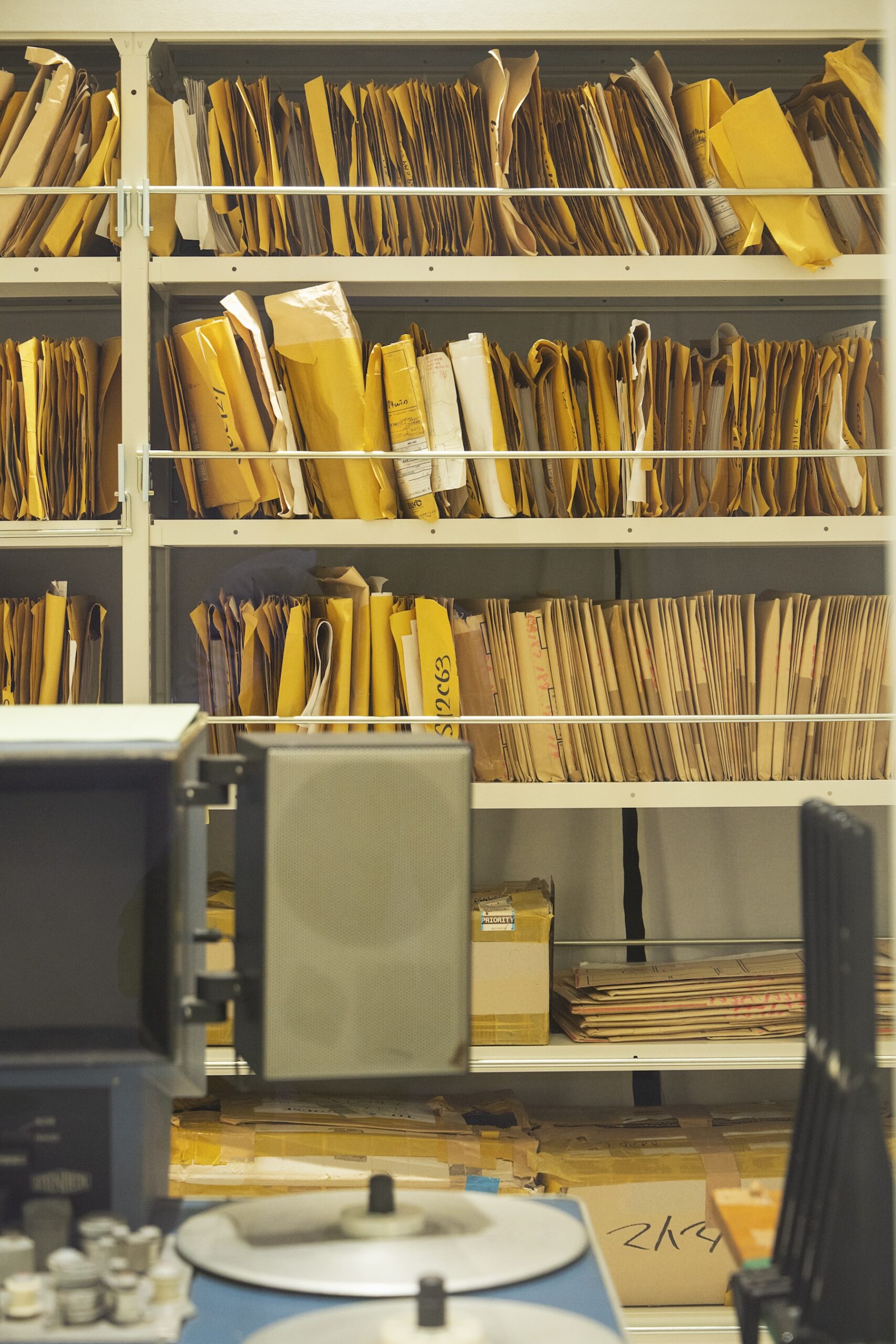 The basement storage facility houses "cut bags"—envelopes containing materials for individual animation cuts, each holding hundreds of documents.