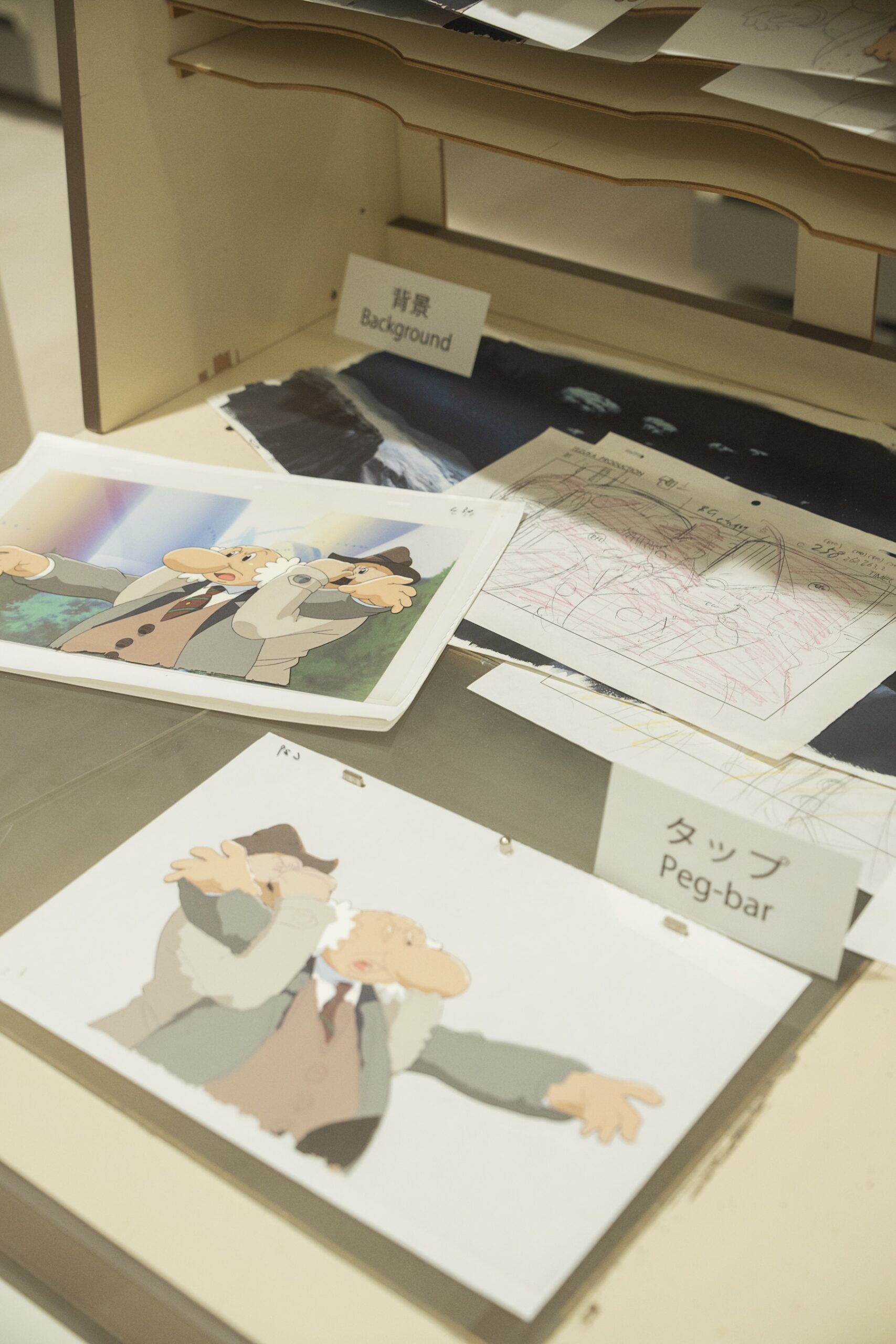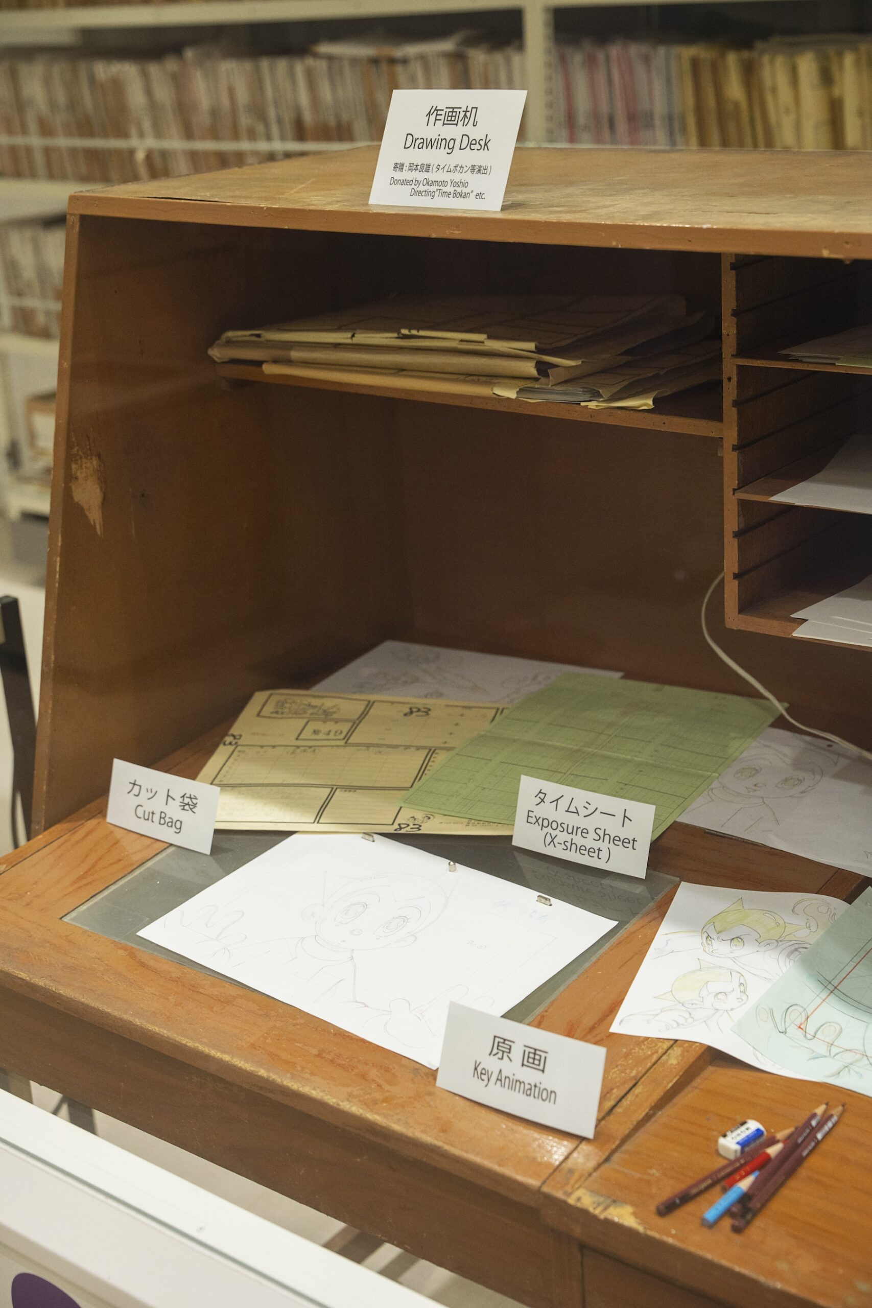 The desks, paints, and tools on display are authentic items actually used by animators, providing a realistic recreation of period production environments.