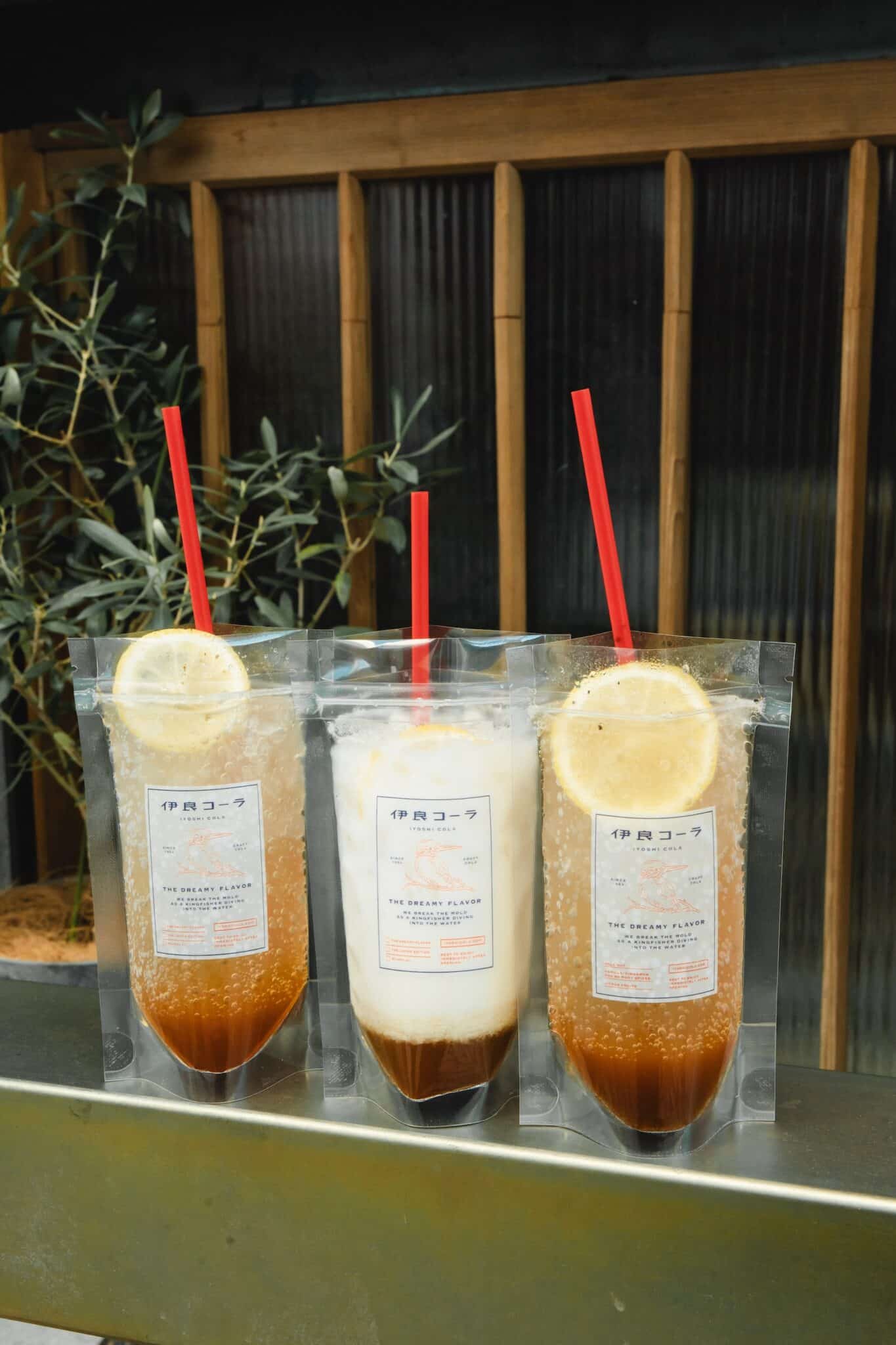 Left: THE DREAMY FLAVOR (700 yen) Right: THE JAPAN EDITION, made with yuzu and sansho (800 yen) Center: IYOSHI MILKOLA (800 yen), made by mixing THE DREAMY FLAVOR with milk and soda—a highly popular repeat-order item.