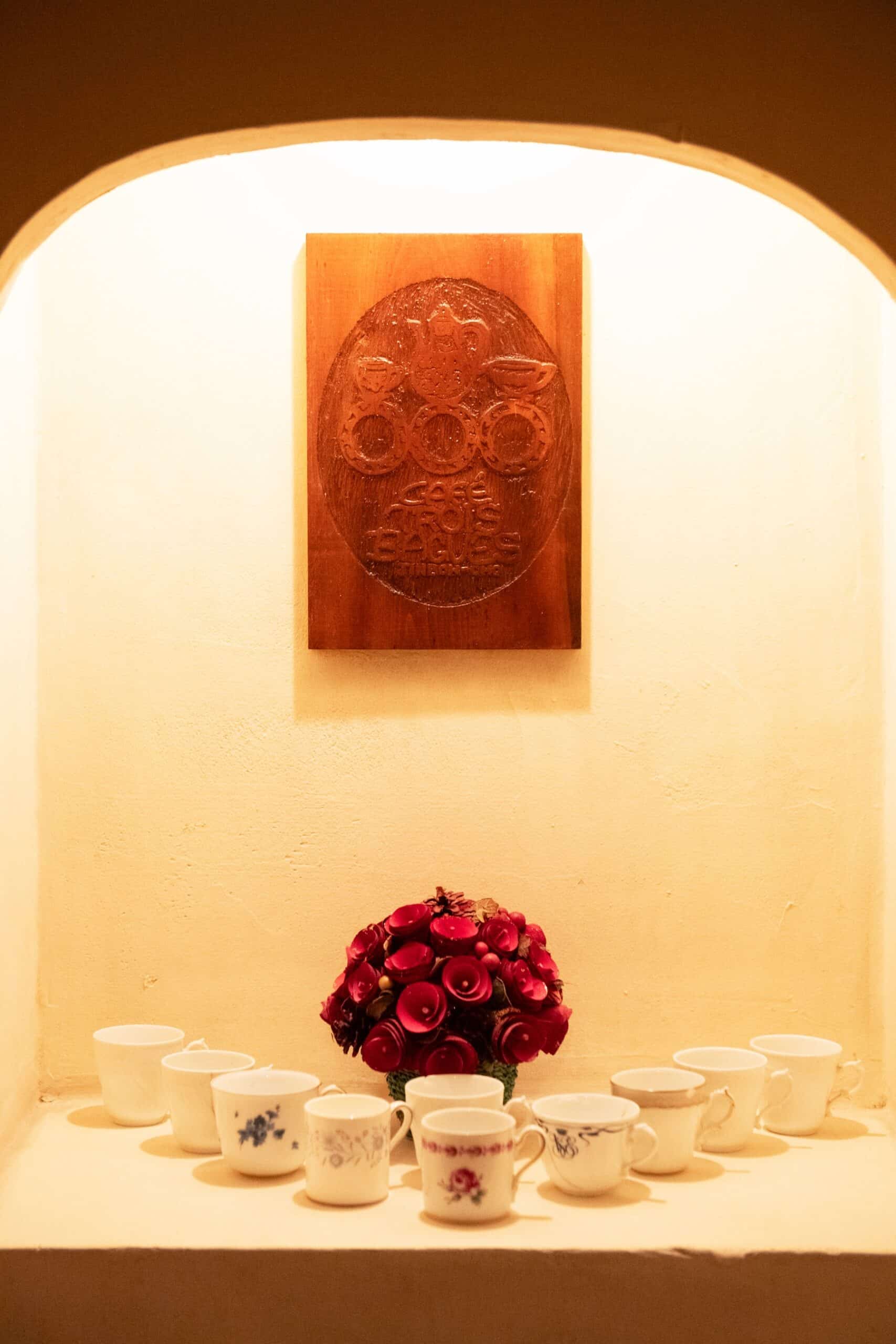 Since opening in 1976, “Trois Bagues” has preserved an interior that celebrates the natural beauty of its materials. The café features unique architectural elements such as beams made from reclaimed railroad sleepers, marble floors, and natural wood framing. Over the years, the space has gained character and continues to warmly welcome every guest. Elegant tableware inherited from the previous owner, along with striped shelving, adds a vibrant touch to the space.