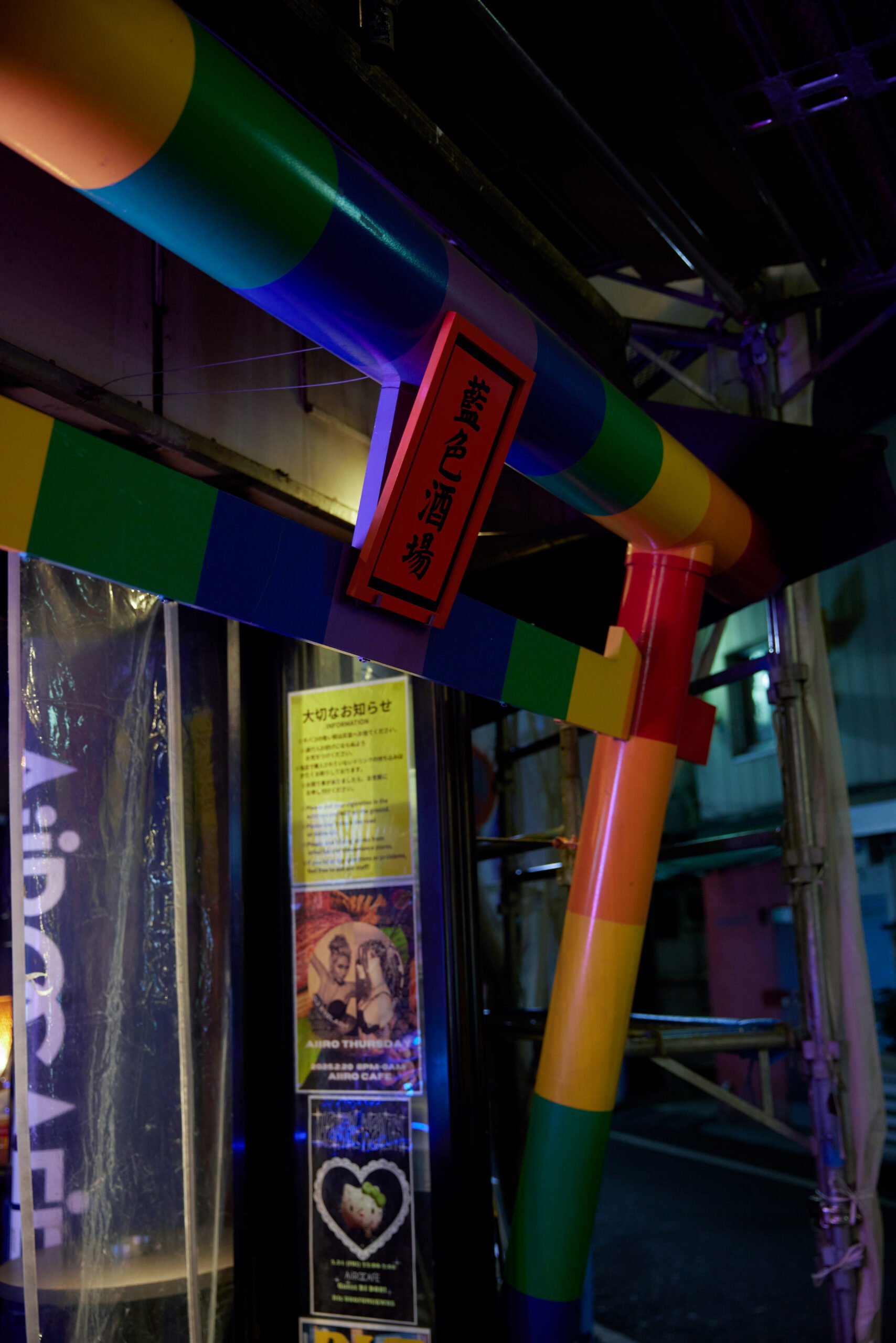 Instead of the typical rainbow flag that symbolizes LGBTQ+ friendliness, a rainbow-colored torii gate—a traditional symbol of Japanese shrines—stands at the entrance.
