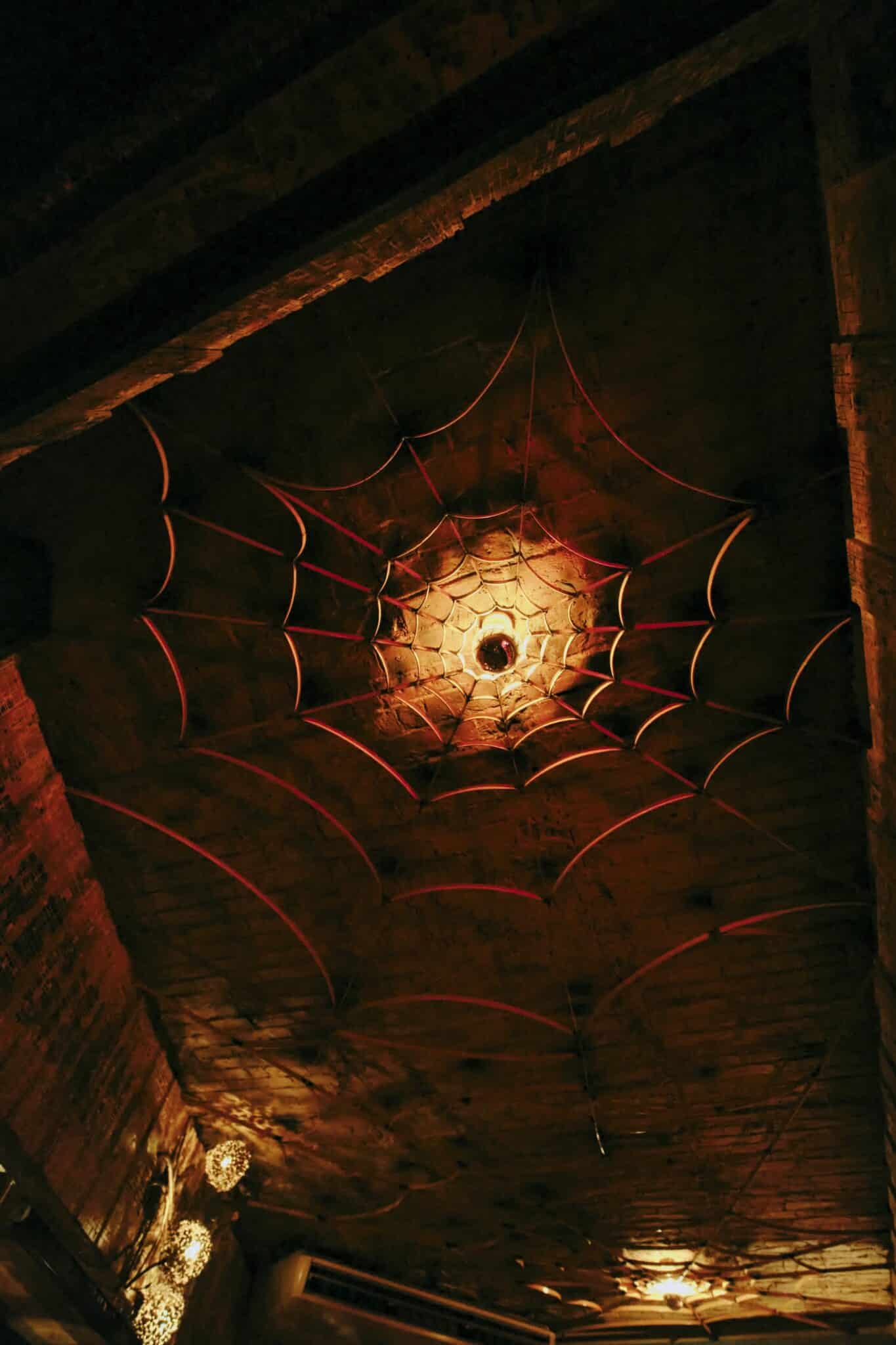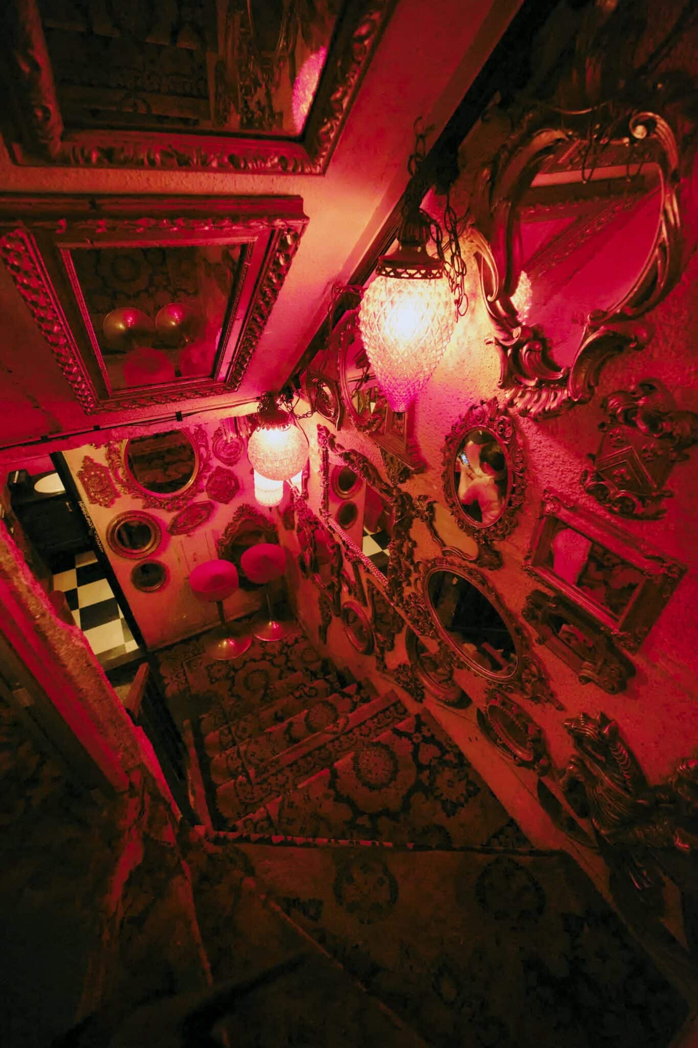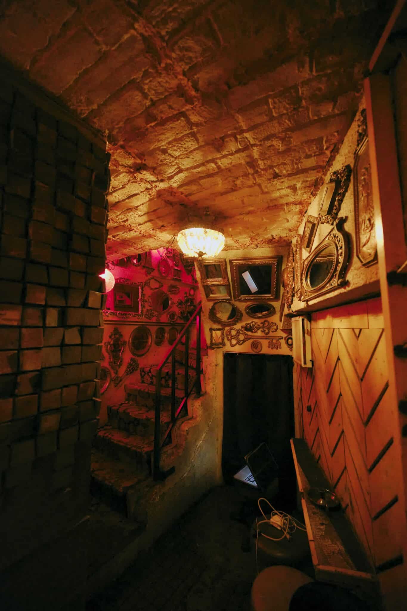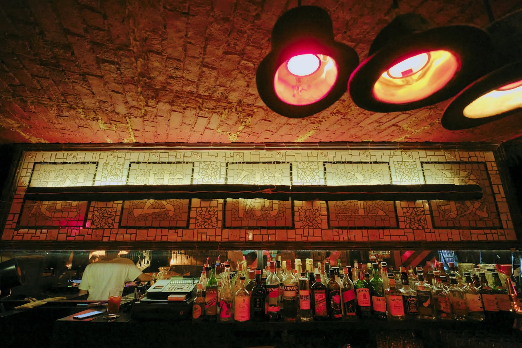 The entrance to the bar is found at the back of “Red Bar” on the first floor. Opening the heavy door and descending the stairs leads you into a completely different world. Soft orange lighting, art objects suspended from the ceiling, and poetic typography across the walls blend with industrial materials and playful shapes, creating the sensation of stepping into an underground club overseas.