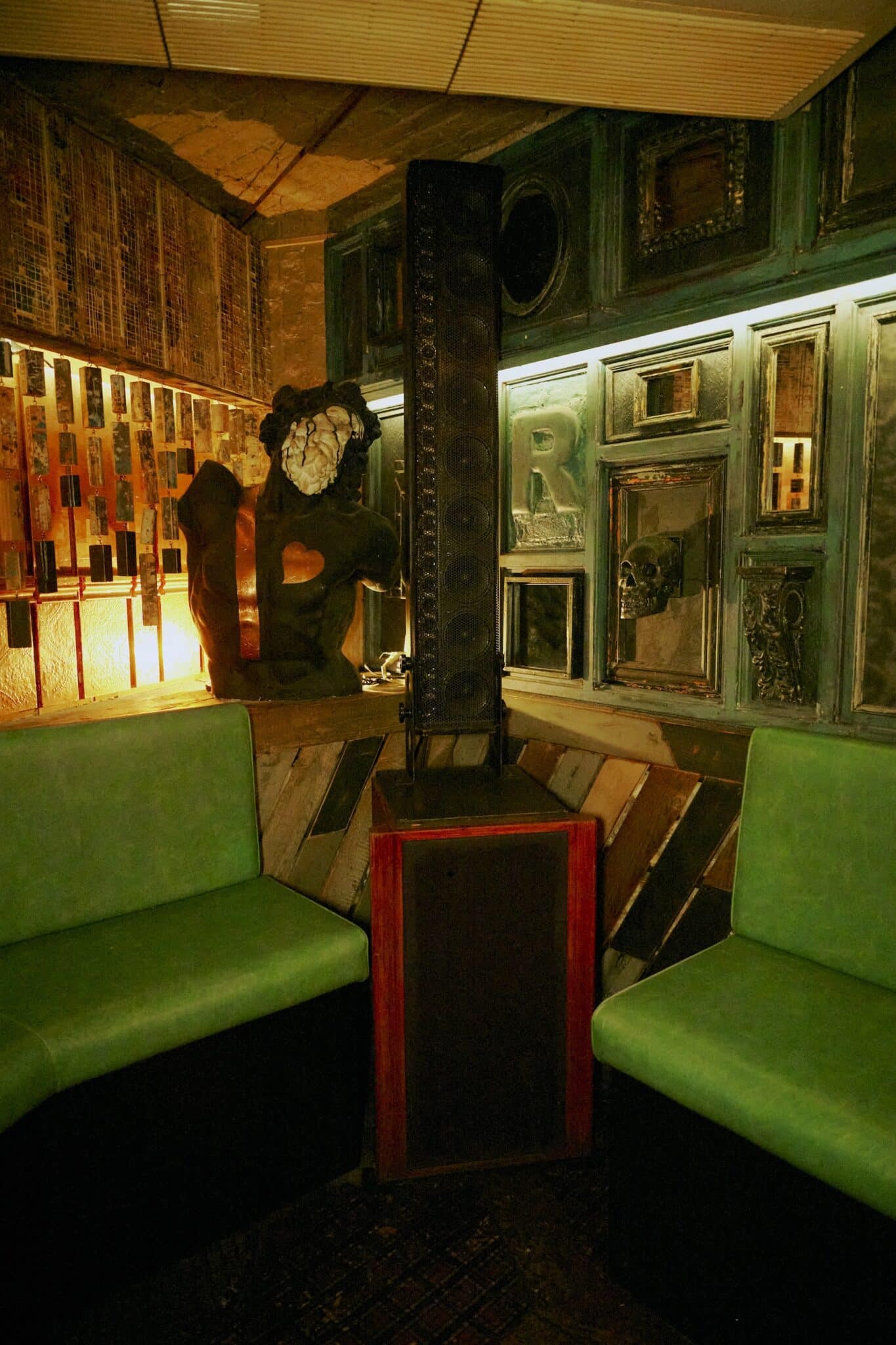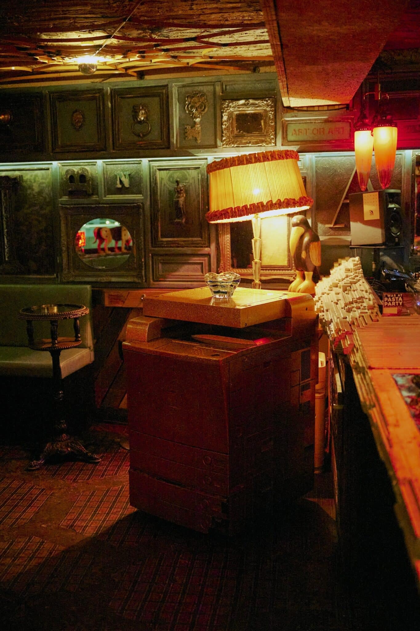 Art objects spread across the ceiling, a unique display featuring a gold-colored photocopier, and lettering inspired by “Chō Geijutsu Shugi” adorn the walls. New poetic typography and art pieces have been added, along with the symbolic phrase “IN THE BEGINNING WAS THE ART,” which expresses the belief that both the bar’s identity and culture itself originate from art.