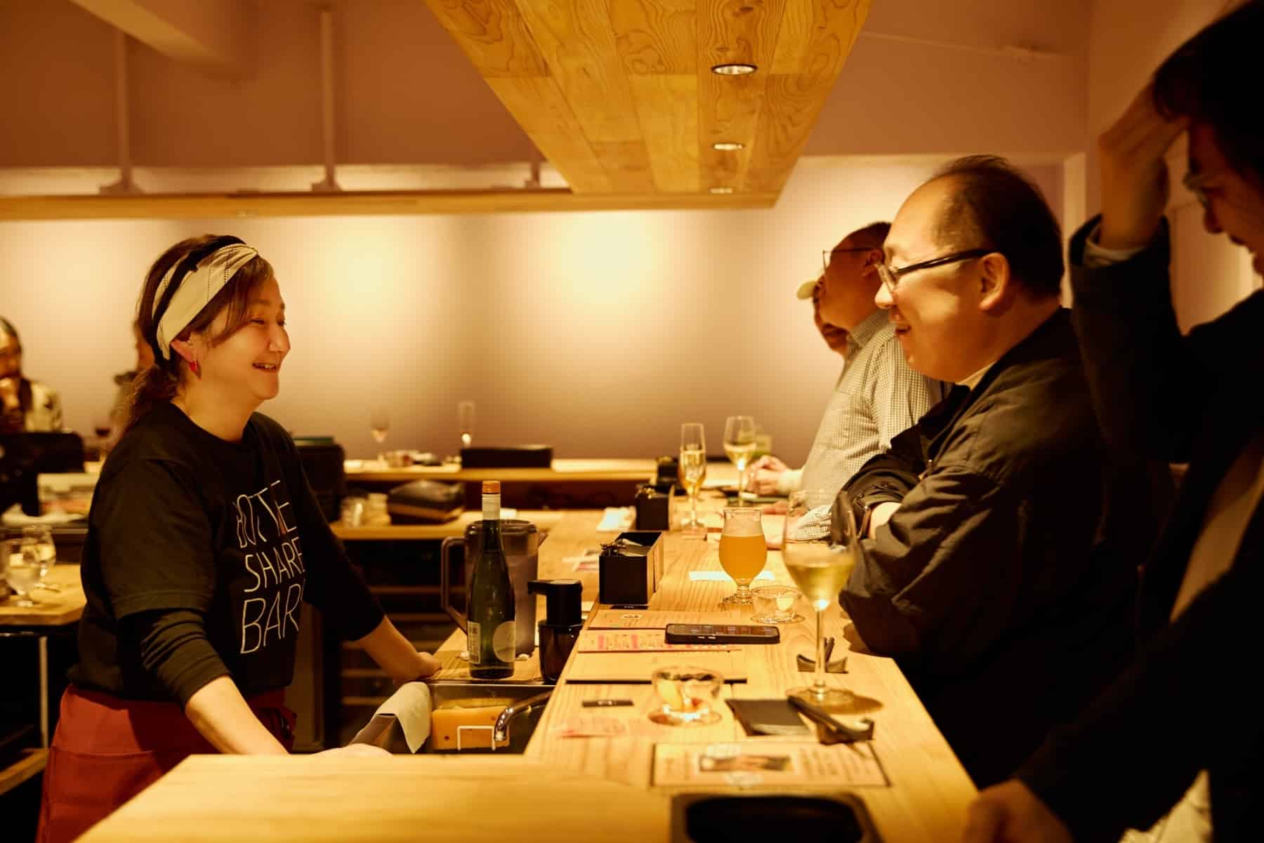 Sumida City is known as one of Tokyo’s leading manufacturing districts, home to countless small workshops. Among them, the Honjo-Azumabashi area stands out for its local, old-town atmosphere—quite different from major tourist spots like Senso-ji Temple. Just a 10-minute walk from Asakusa Station, BOTTLE SHARE BAR opened on the far side of Azumabashi Bridge, with Tokyo Skytree rising in the background. Warm lighting fills the space, creating an inviting setting where people naturally gather.