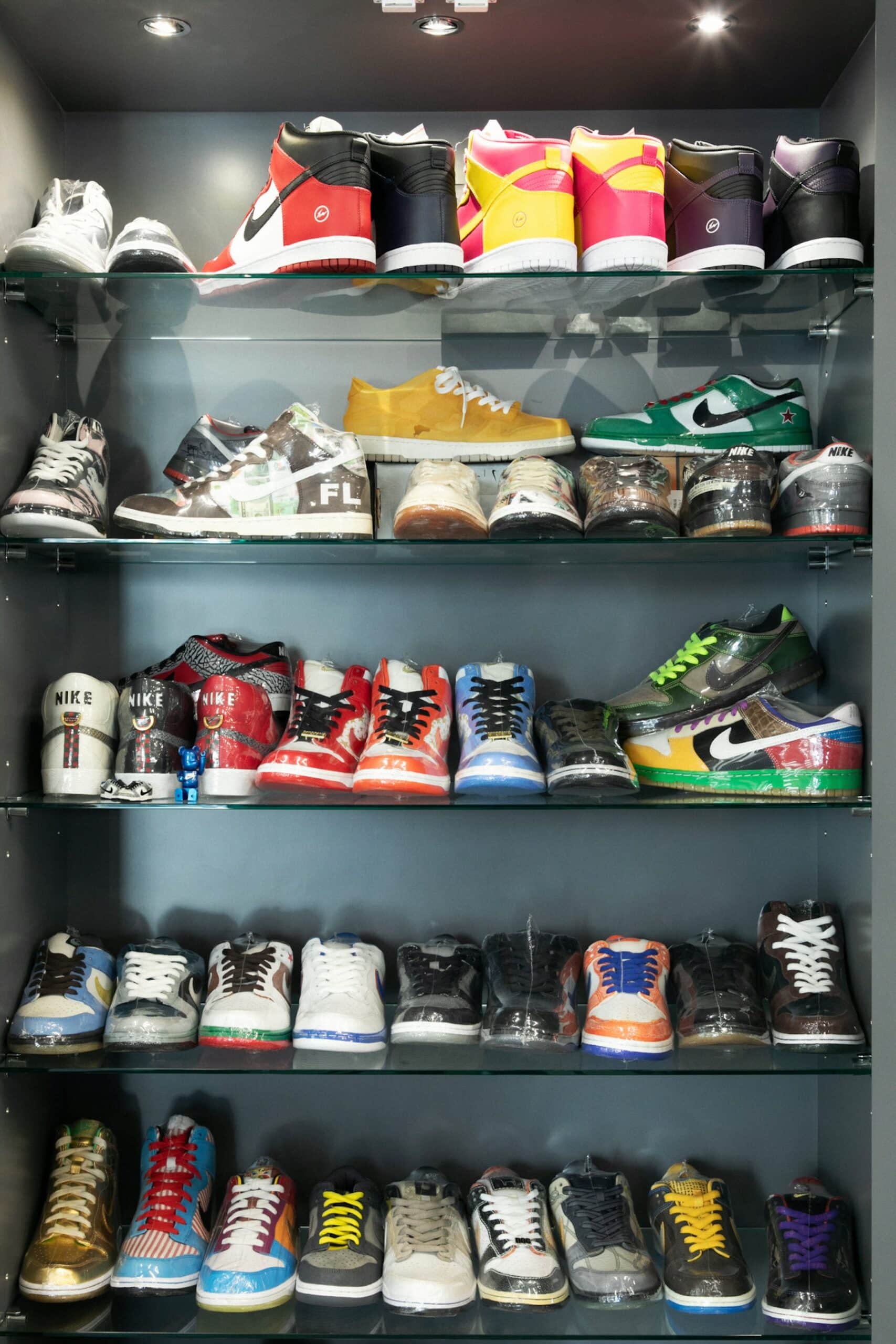 Inside the display case are rare models like "Air Force 1," "SB Dunk," and "Air Jordan"—from limited releases to iconic collaborations.