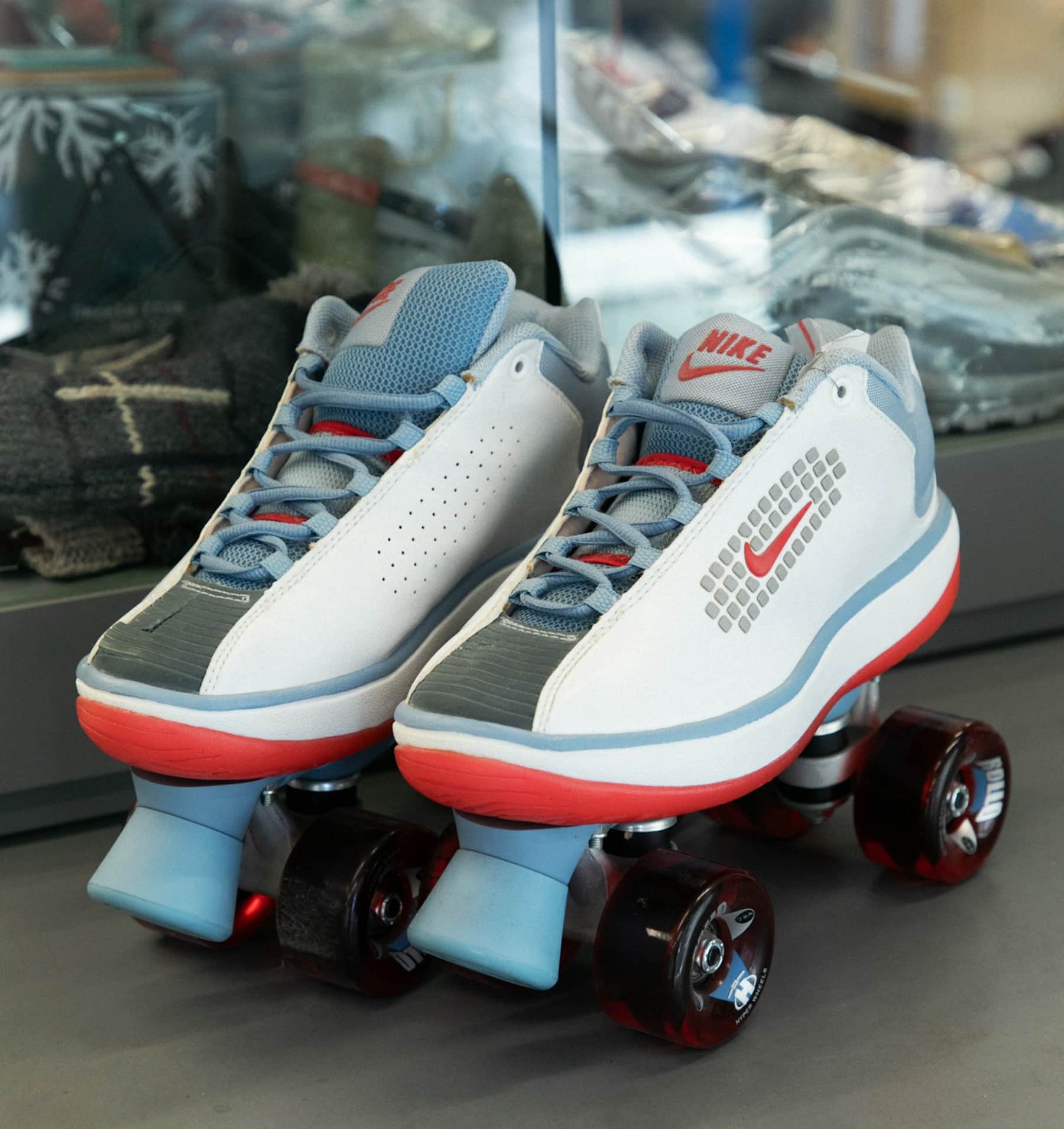 "Nike" roller skate shoes from the 1990s. Some rare models are displayed in-store as collector's pieces.