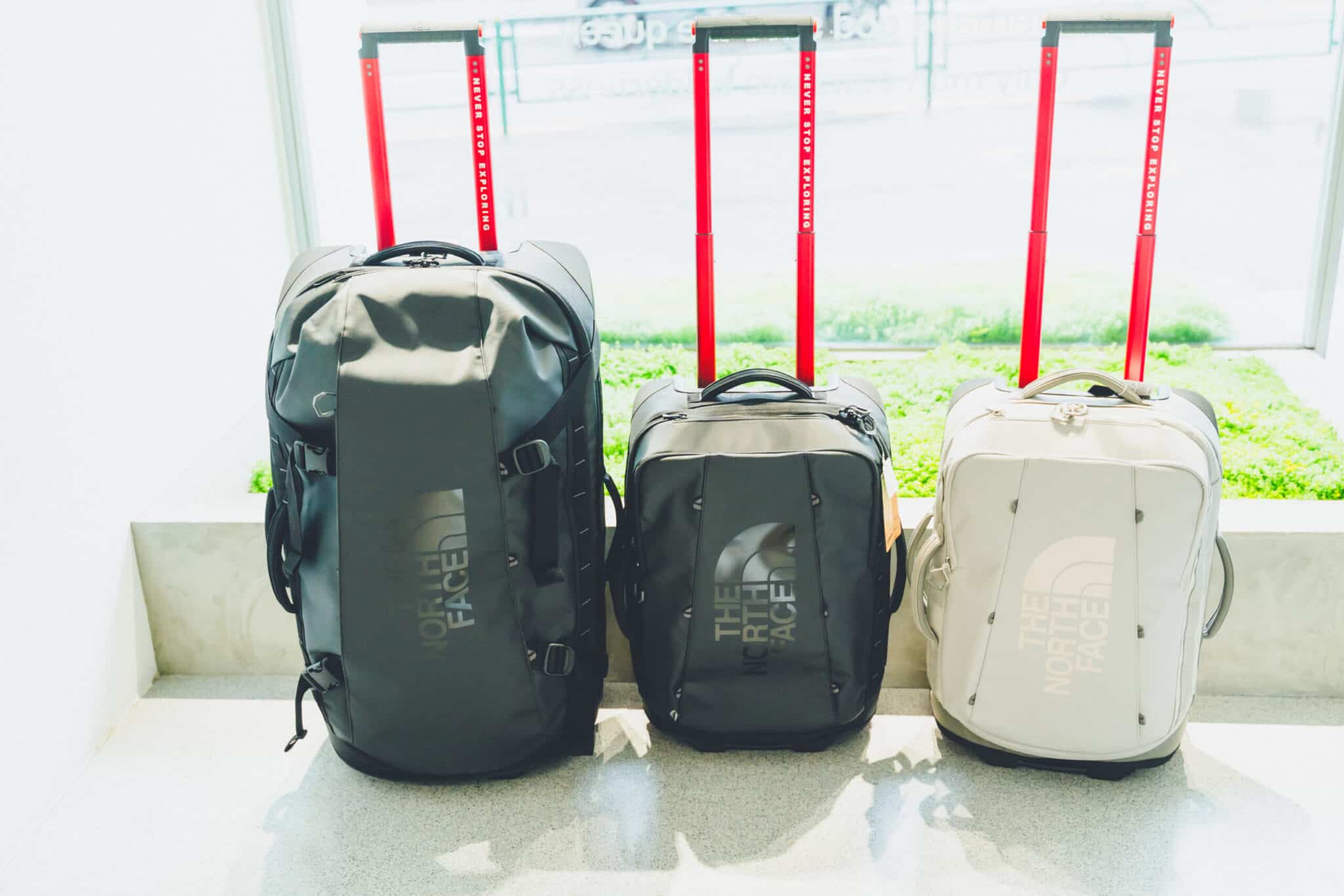 Durable, water- and dirt-resistant carry bags. Molded back panels maintain shape even with heavy gear. Large 9cm wheels ensure smooth rolling on rough terrain. (Left) 95L ¥53,130; (Center, Right) 40L ¥46,750