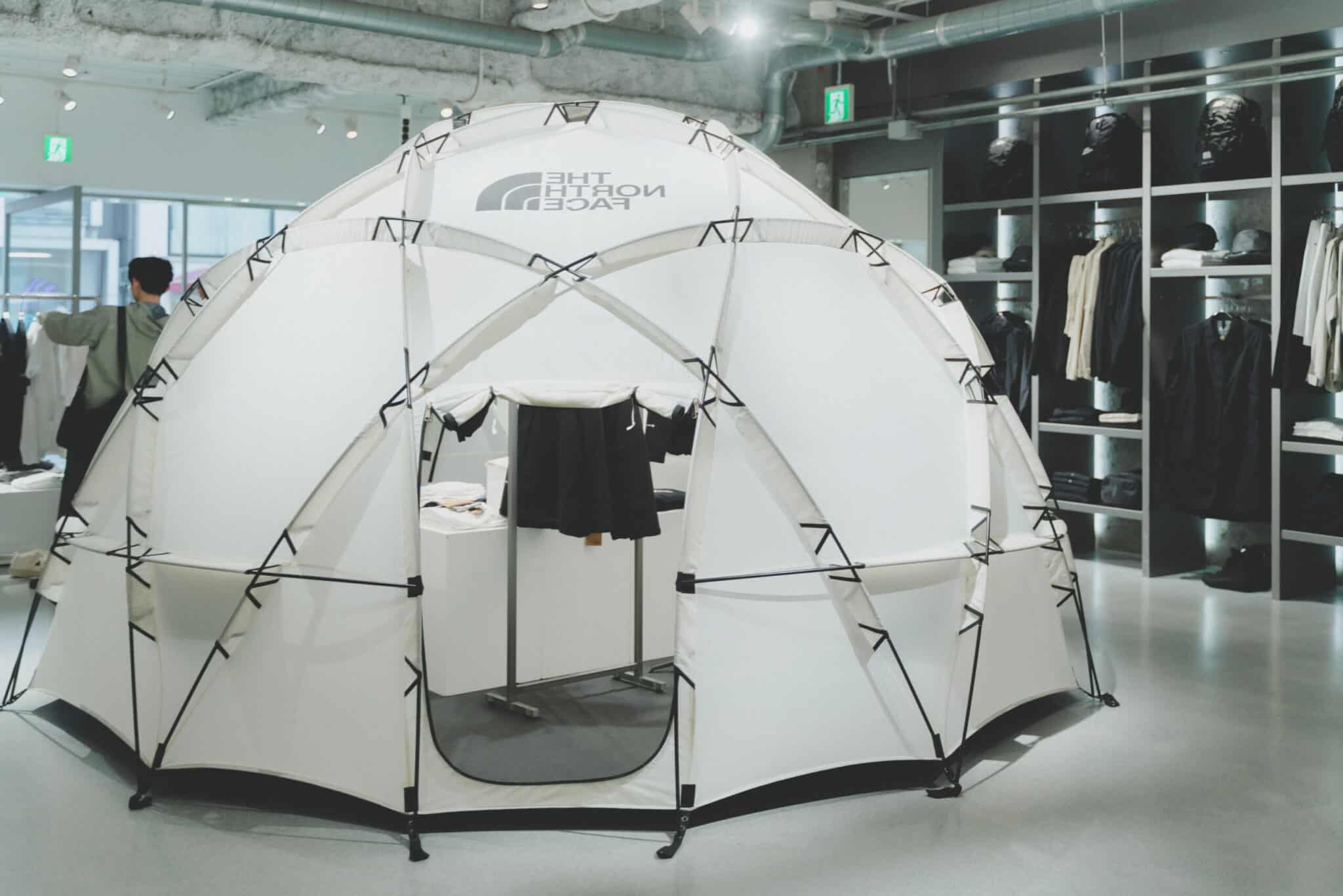 A stark-white dome tent located in the back of the store serves as a symbolic space for the brand. Inside, visitors will find seasonal product displays and occasional pop-up exhibits. Along both side walls, apparel items are organized by color, creating a clean and visually appealing layout. Potted plants at the entrance further enhance the store’s atmosphere, promoting harmony with nature.