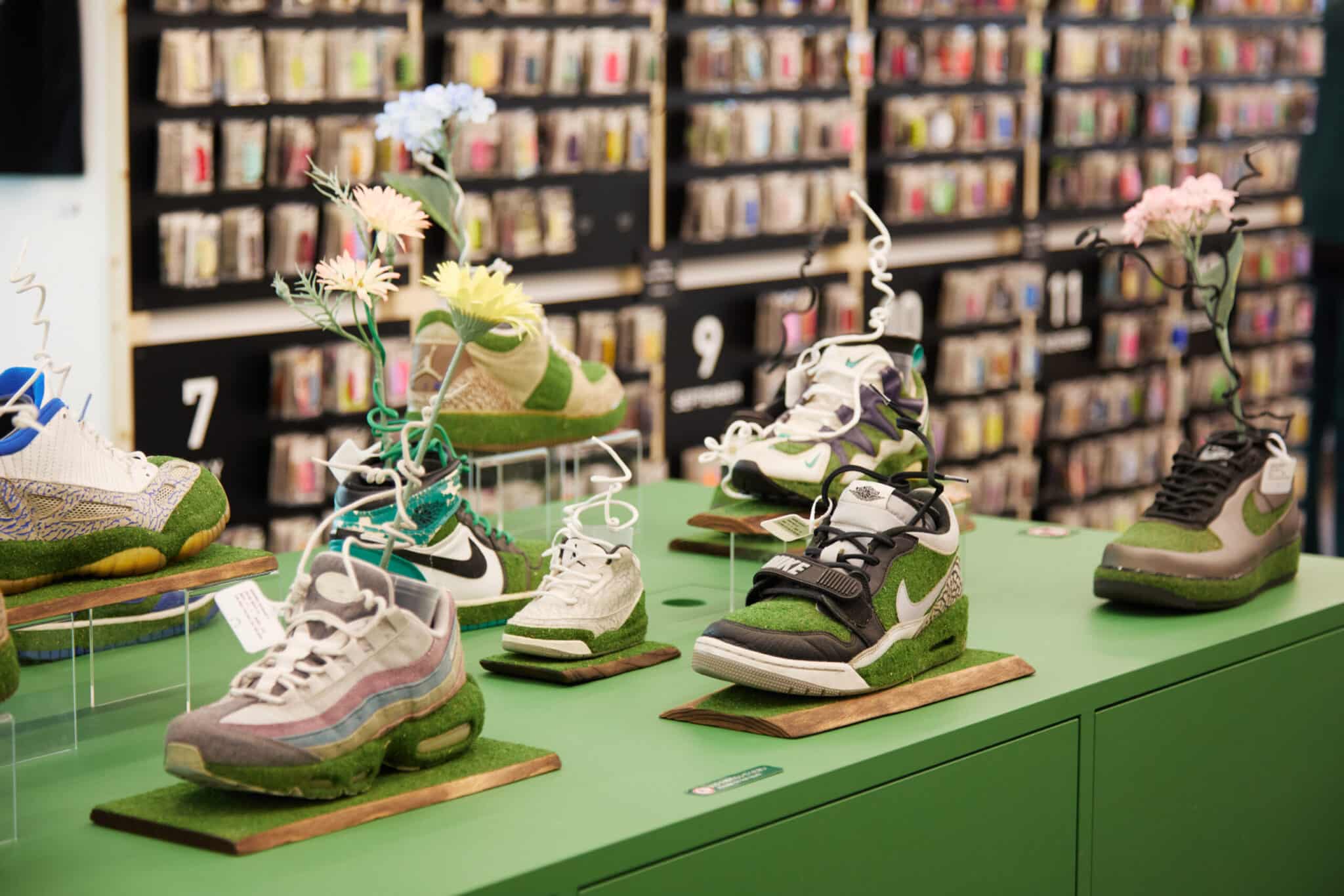 The memorable first solo exhibition featured Kosuke Sugimoto.At the center is his art piece “SHOETREE,” in which deteriorated sneakers are used as planters to display plants.