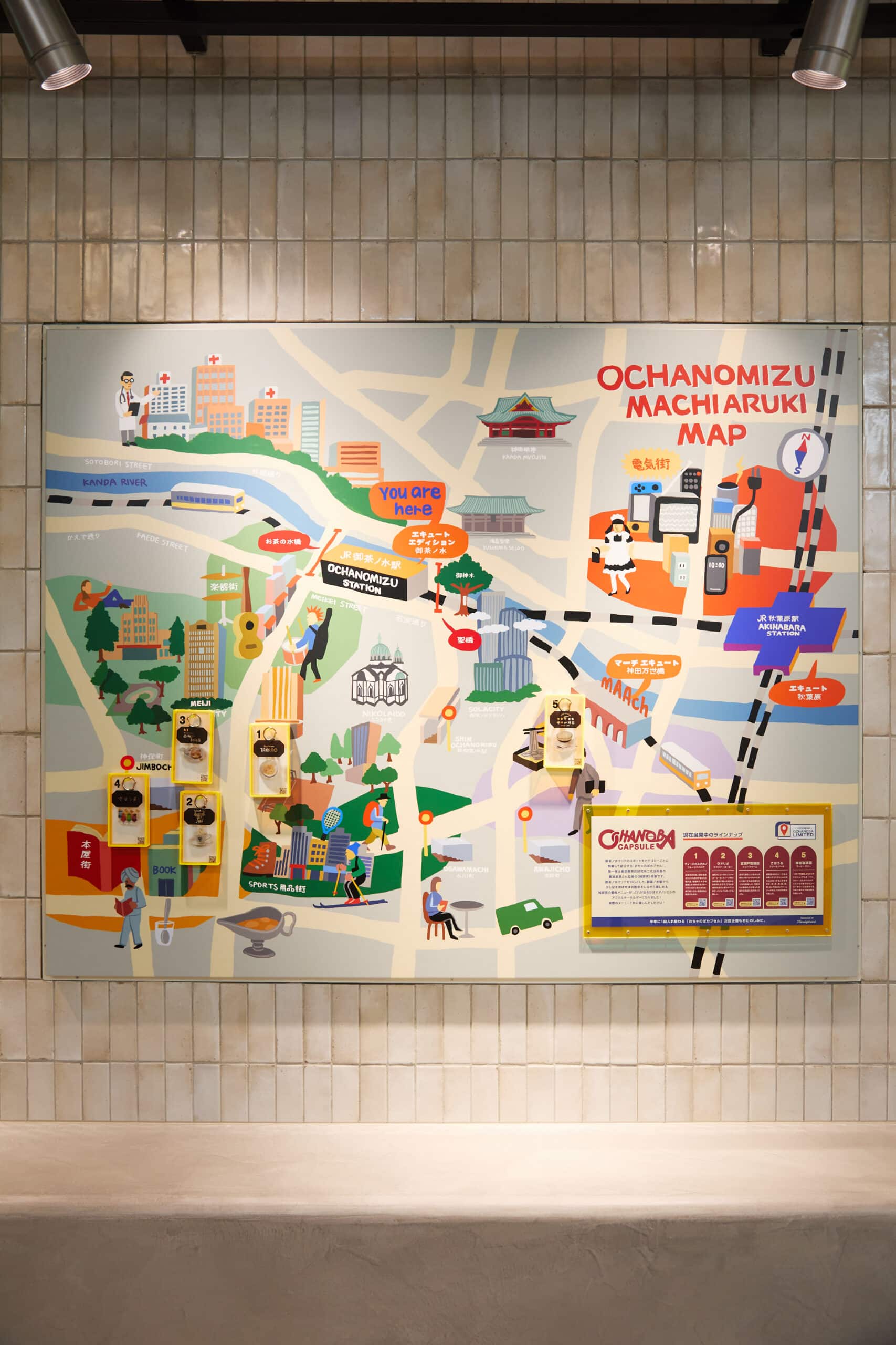 The community space “Ochanoba,” located near the entrance on the same floor as “Ken Elebenshitsu,” is also operated by “Ken Elephant.”This space features free papers published around the Ochanomizu area, as well as the “Walking Map,” which highlights local attractions and showcases the charm of the neighborhood.The “Walking Map” comes with an acrylic keychain featuring notable spots, available for purchase from the capsule toy machines installed there.These capsule toys are exclusive to “Ochanoba,” making them perfect as souvenirs from Ochanomizu.