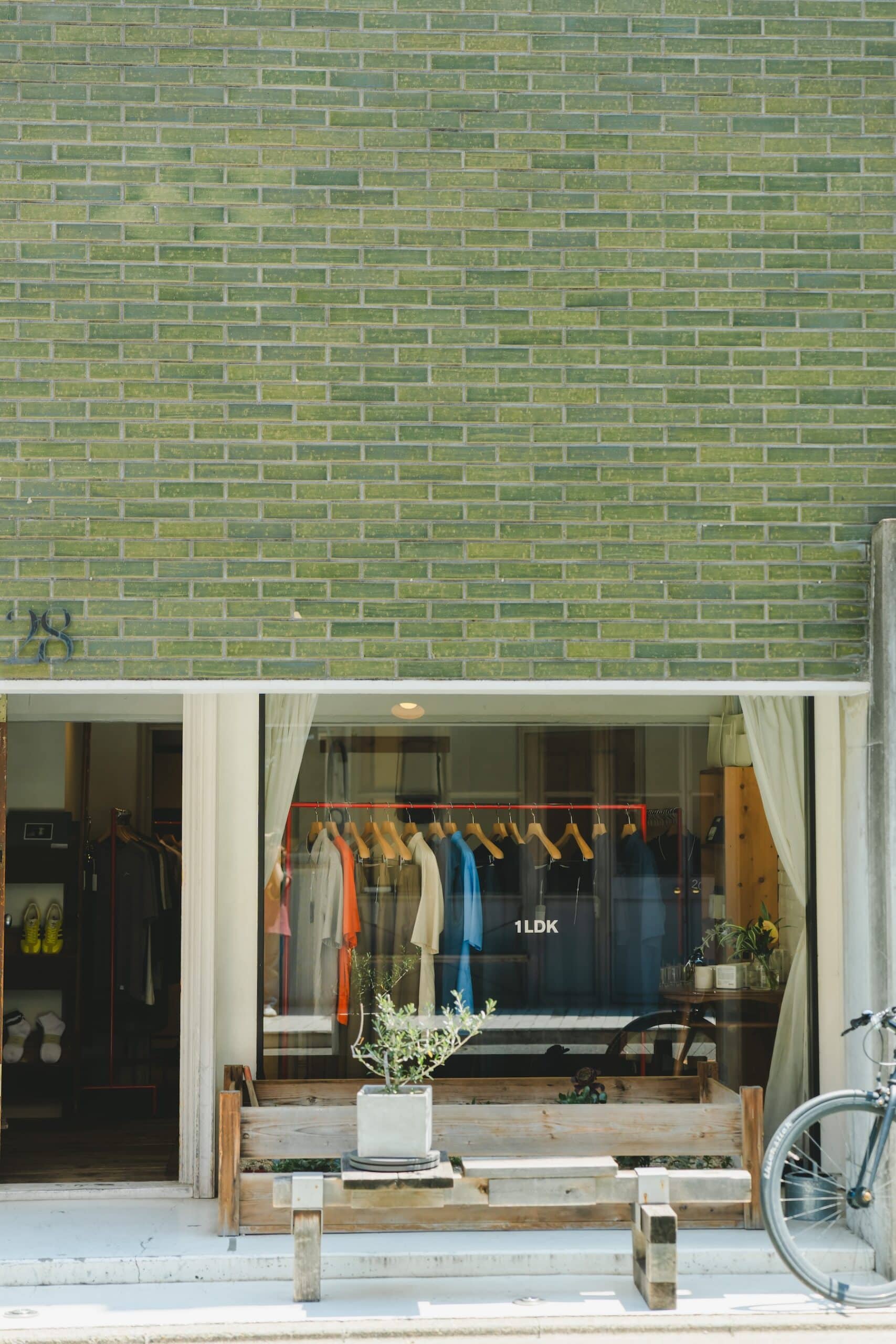 The store’s subtle exterior blends seamlessly into the residential surroundings, with a green tiled facade that serves as a subtle landmark.