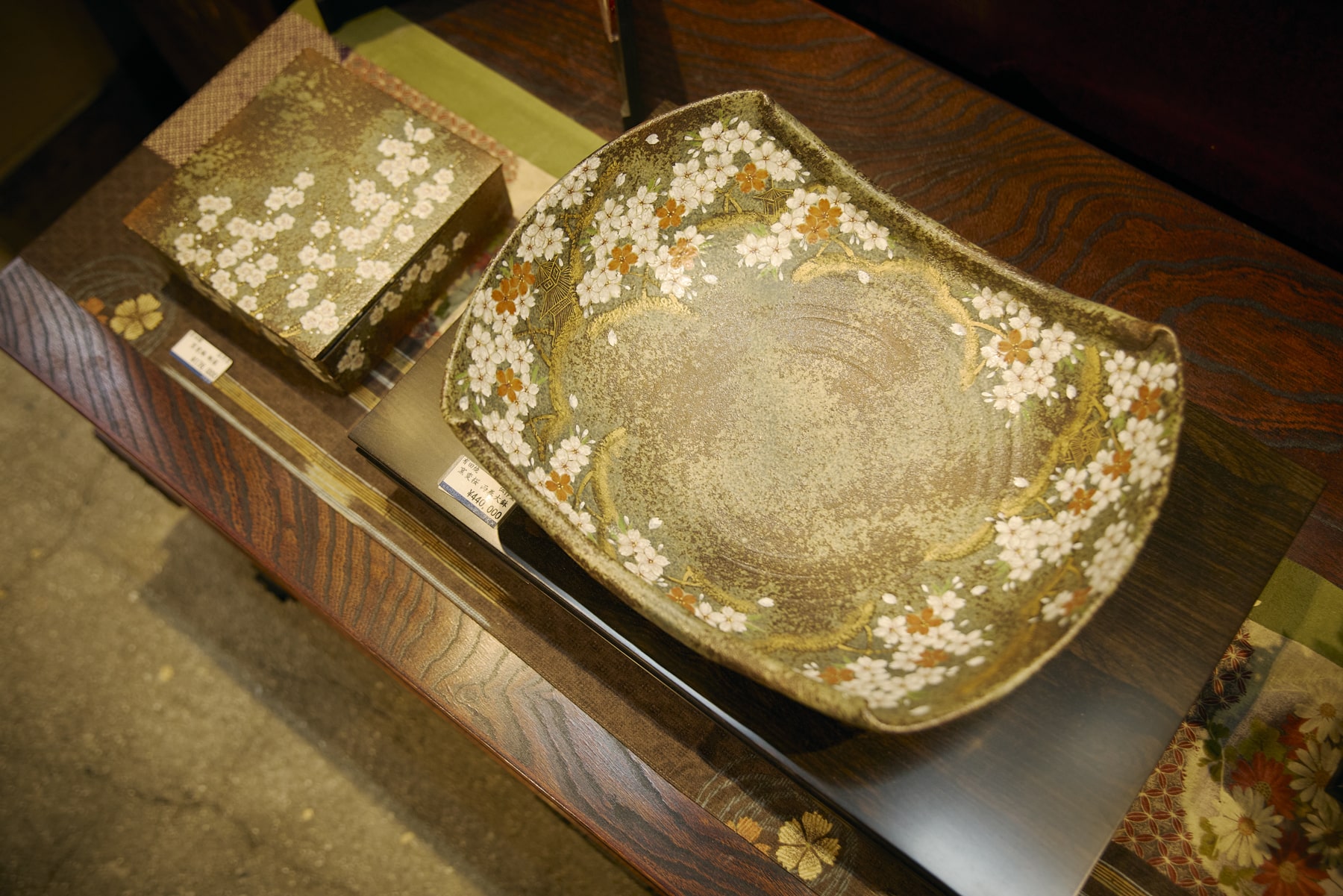 The large bowl on the right, made by Densakugama of Arita ware, uses a technique known as yōhen (kiln transformation). Irregular changes in color and texture that occur during firing result in a unique finish for every piece. Arita ware, Densakugama Kiln-transformed cherry blossom large bowl 440,000 yen