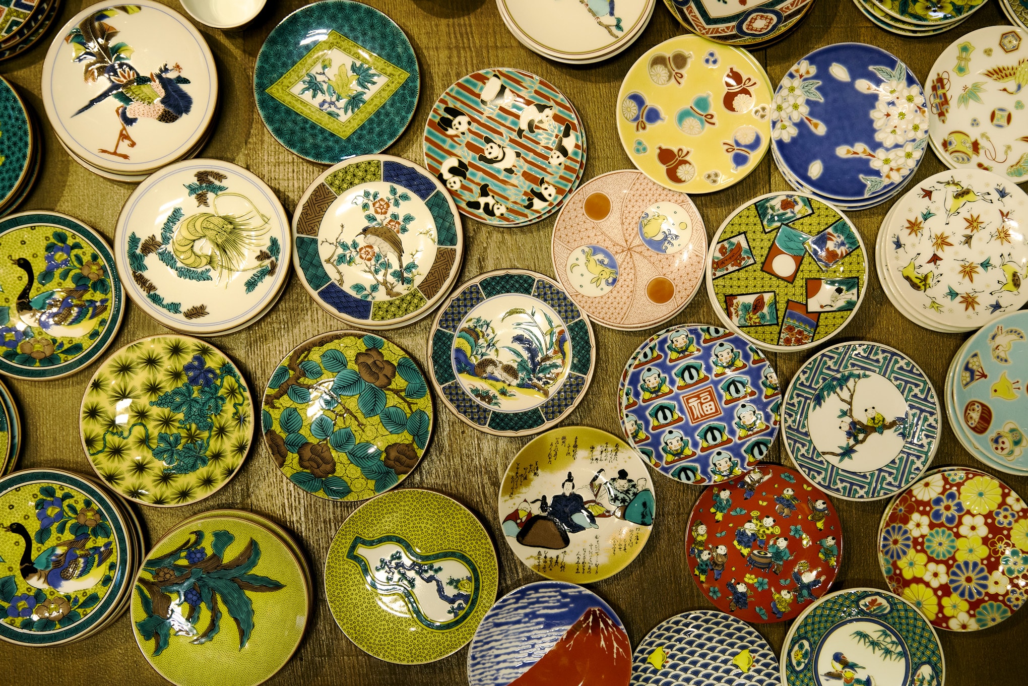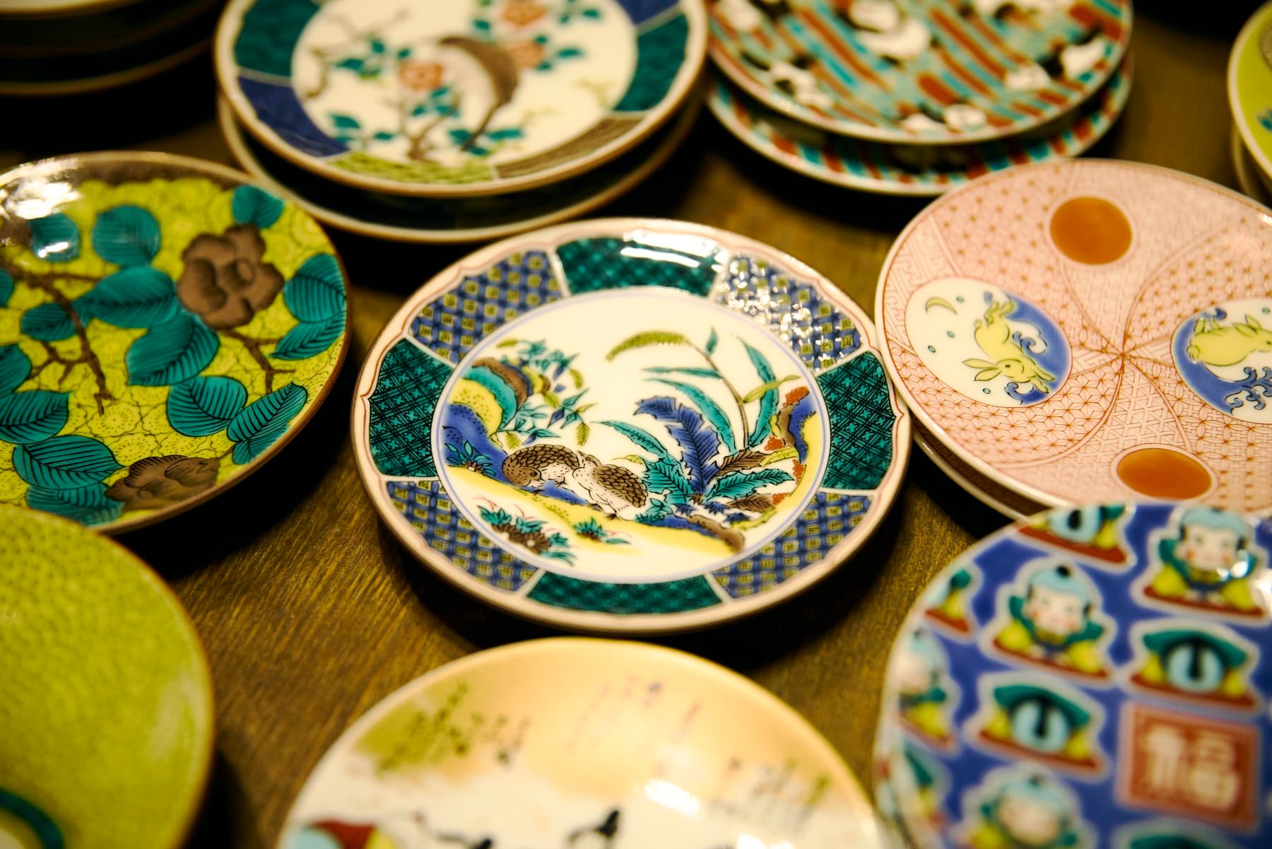 Kutani ware from Ishikawa Prefecture is distinguished by its bold and vividly colored designs. The technique known as Kutani Gosai, which uses five colors—red, yellow, green, purple, and deep blue—is applied in thick layers, creating a glossy, glass-like finish. Many pieces feature painterly compositions, and some are valued as fine art. The photo shows small plates by Seikogama, a popular Kutani ware kiln (¥1,190 each).