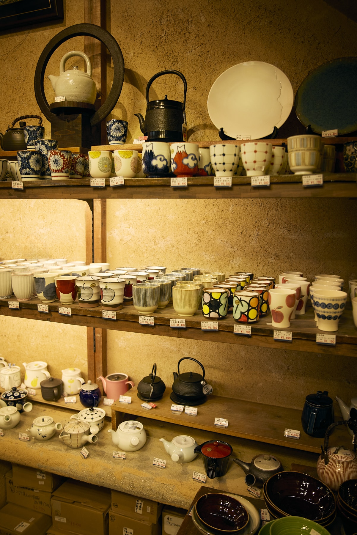 Yunomi designed for everyday use are gathered toward the back of the first floor. Pairing them with a teapot is also recommended.
