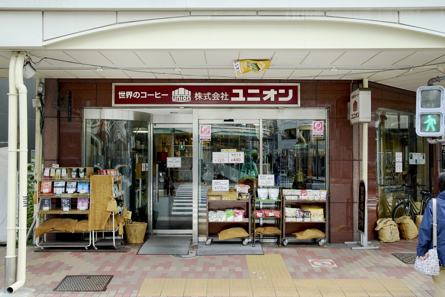 Across the street is a specialty shop for coffee beans. Customers can select and purchase beans together with their coffee equipment.