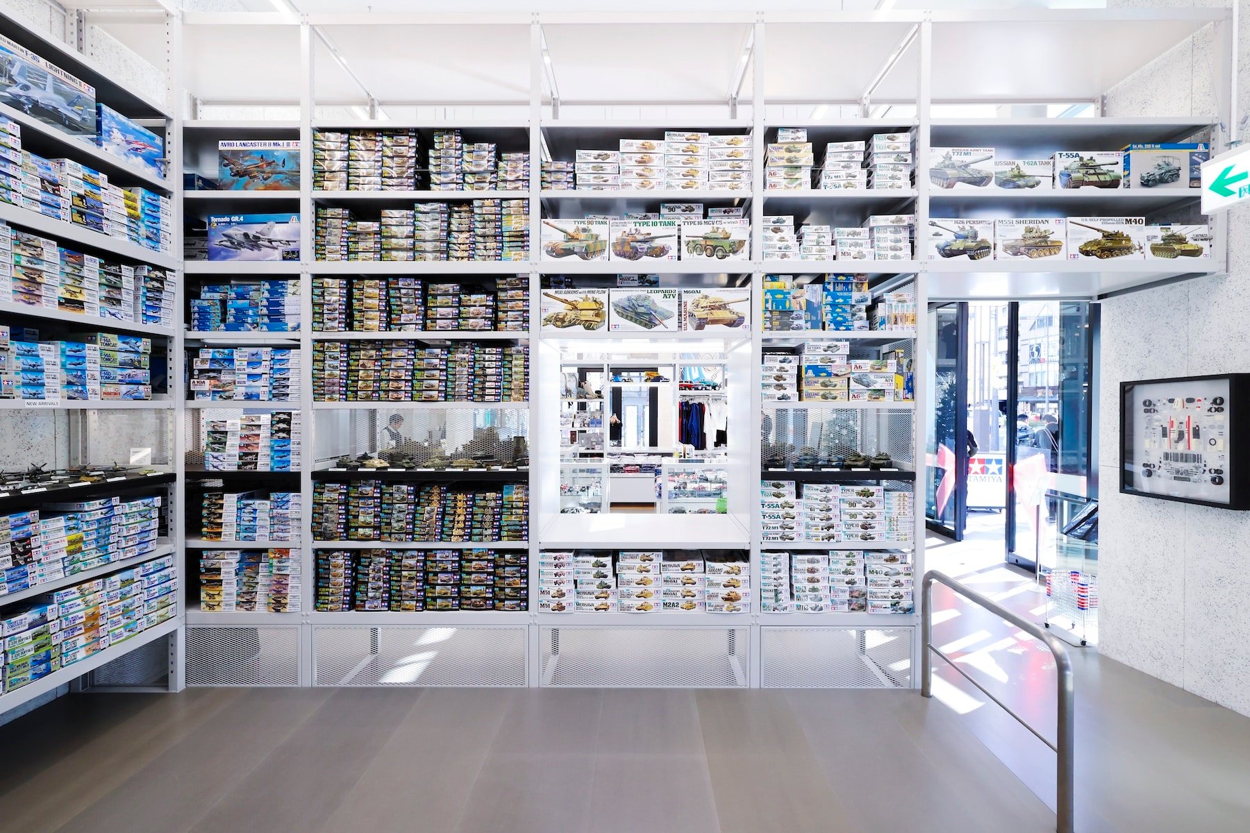 Upon entering the facility, the first thing to capture visitors’ attention is a massive cabinet standing approximately four meters high and extending nearly 100 meters in length. Arranged in a zigzag pattern, the shelves display around 6,000 models, creating a scene reminiscent of a model museum. Playful design elements are incorporated throughout, such as drawers concealing large quantities of parts, stimulating visitors’ curiosity at every turn. With a café space and a wide selection of Tamiya merchandise, the facility offers a place where models can be enjoyed not merely as a hobby, but as a form of culture and experience.