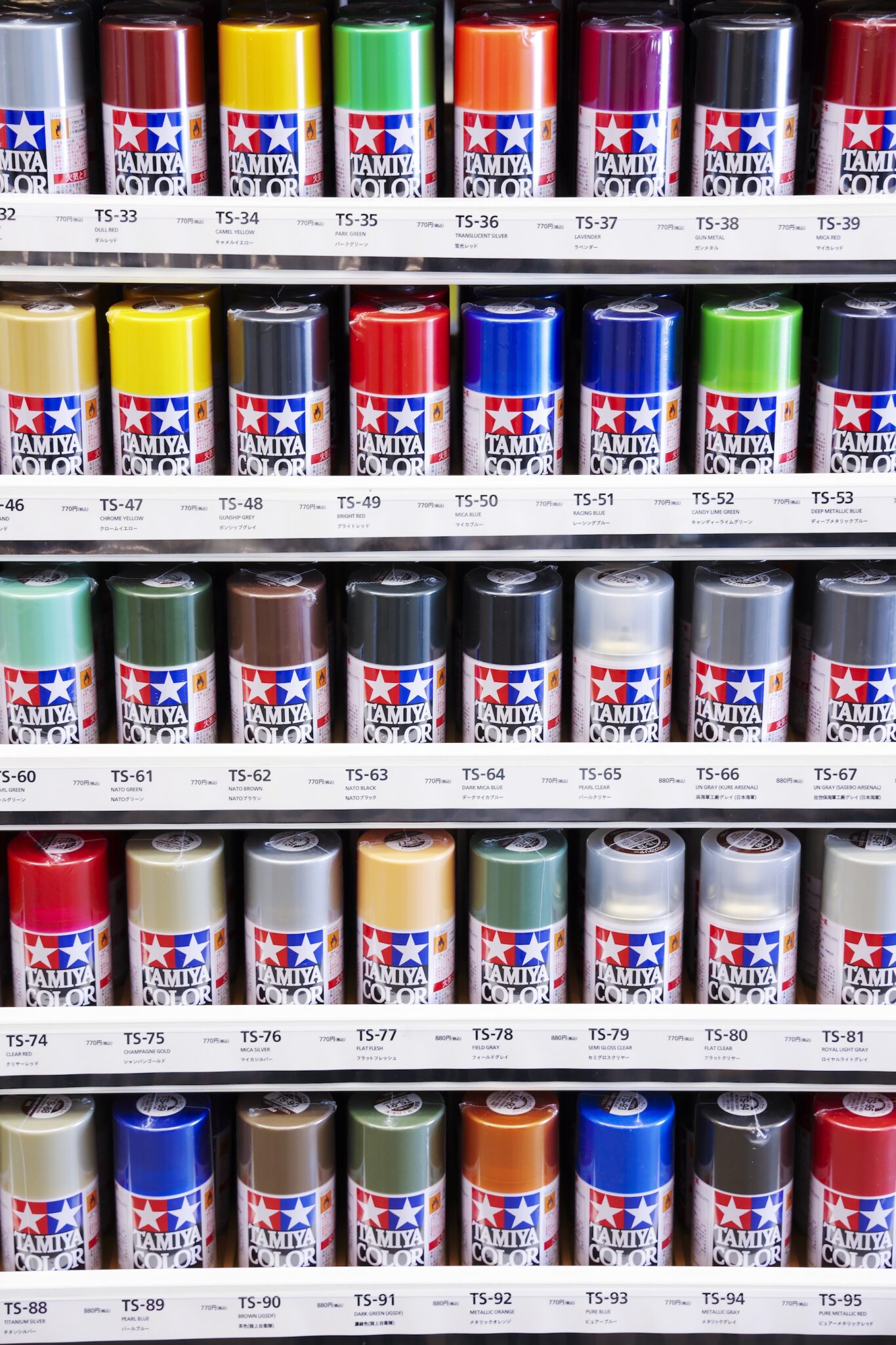 Tamiya spray paints, known for their vivid color development and rich variety of shades. An essential staple for model making. ¥770–¥1,540.