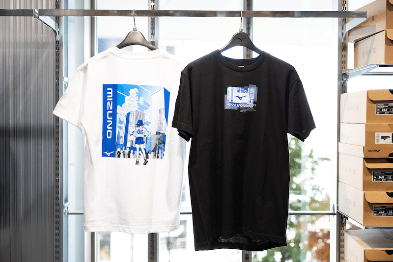 The store interior is extremely simple, built around industrial elements so that the sculptural beauty of the sneakers can stand out. The lineup is extensive, centered on eight models and around 42 styles, including color variations. Highlights include the high-tech "WAVE PROPHECY LS," equipped with the proprietary "Infinity Wave" technology, and the "WAVE RIDER 10," a revival of a running model that first debuted in 1997. The "Shibuya" store is especially known for carrying a wide range of collaboration models, and at the time of our visit, the shelves featured releases created with Germany’s sneaker boutique "AFEW" and Singapore-born global sneaker artist "Mr. Sabotage," among others. T-shirts available only at the "Shibuya" store are also popular as souvenirs from Japan.