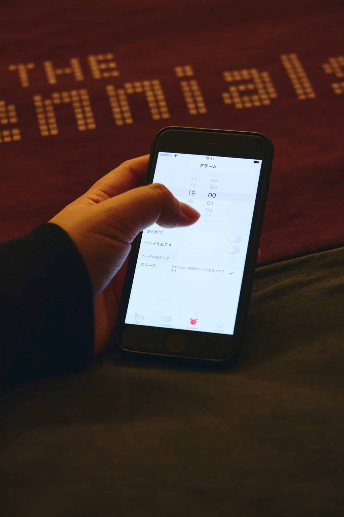 Instead of using sound, the alarm encourages waking through the reclining function. This design was developed with consideration for guests arriving on late-night flights and those adjusting to different time zones.