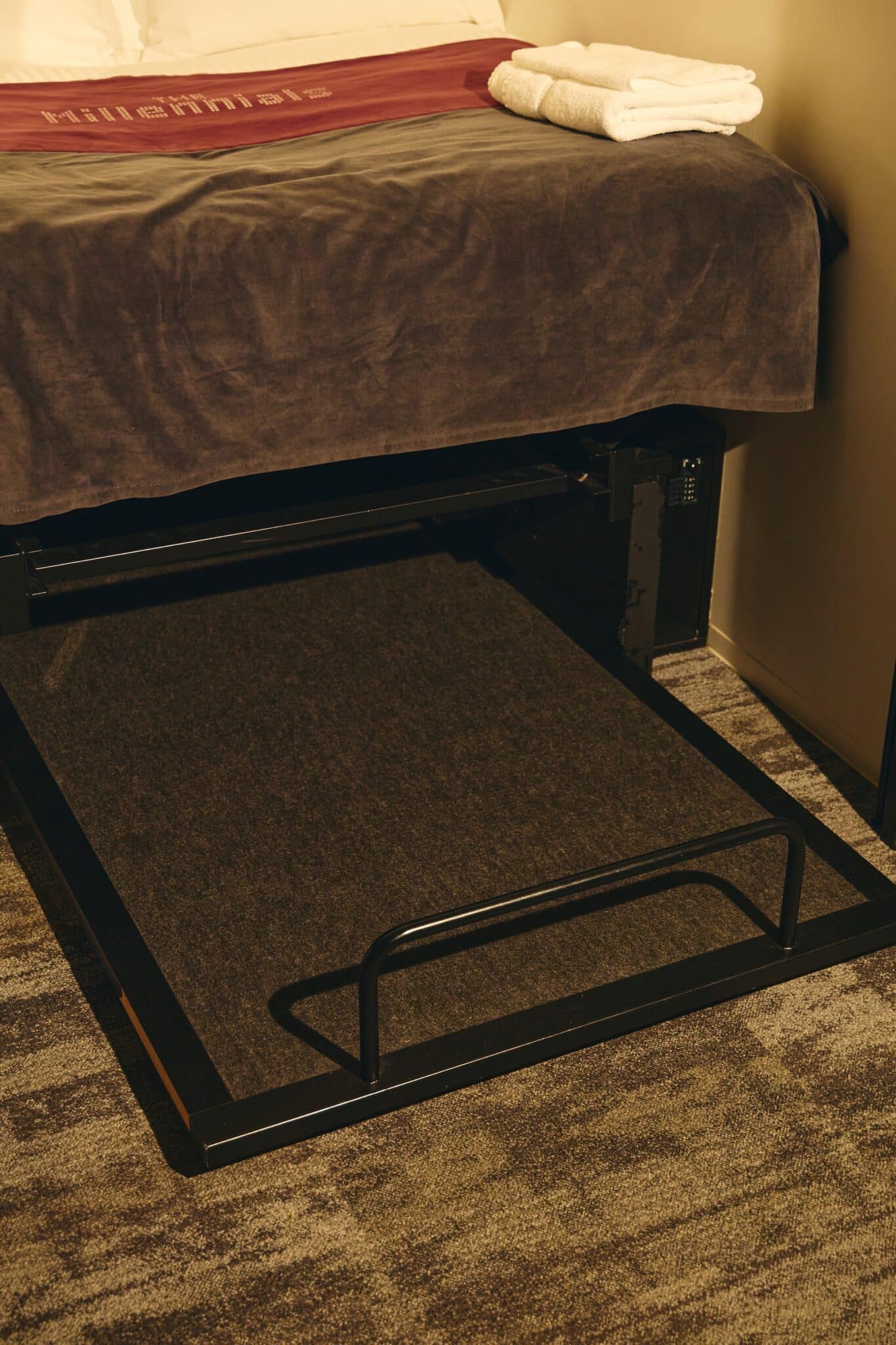A large storage space beneath the bed accommodates suitcases.