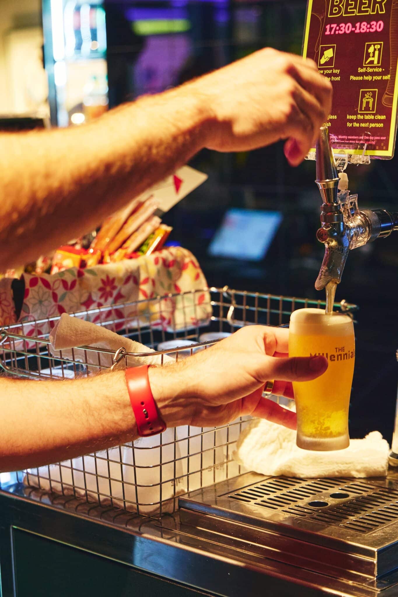 The beer server is self-service. The layout naturally encourages guests to gather around the same table and start conversations.