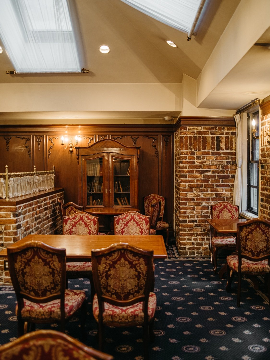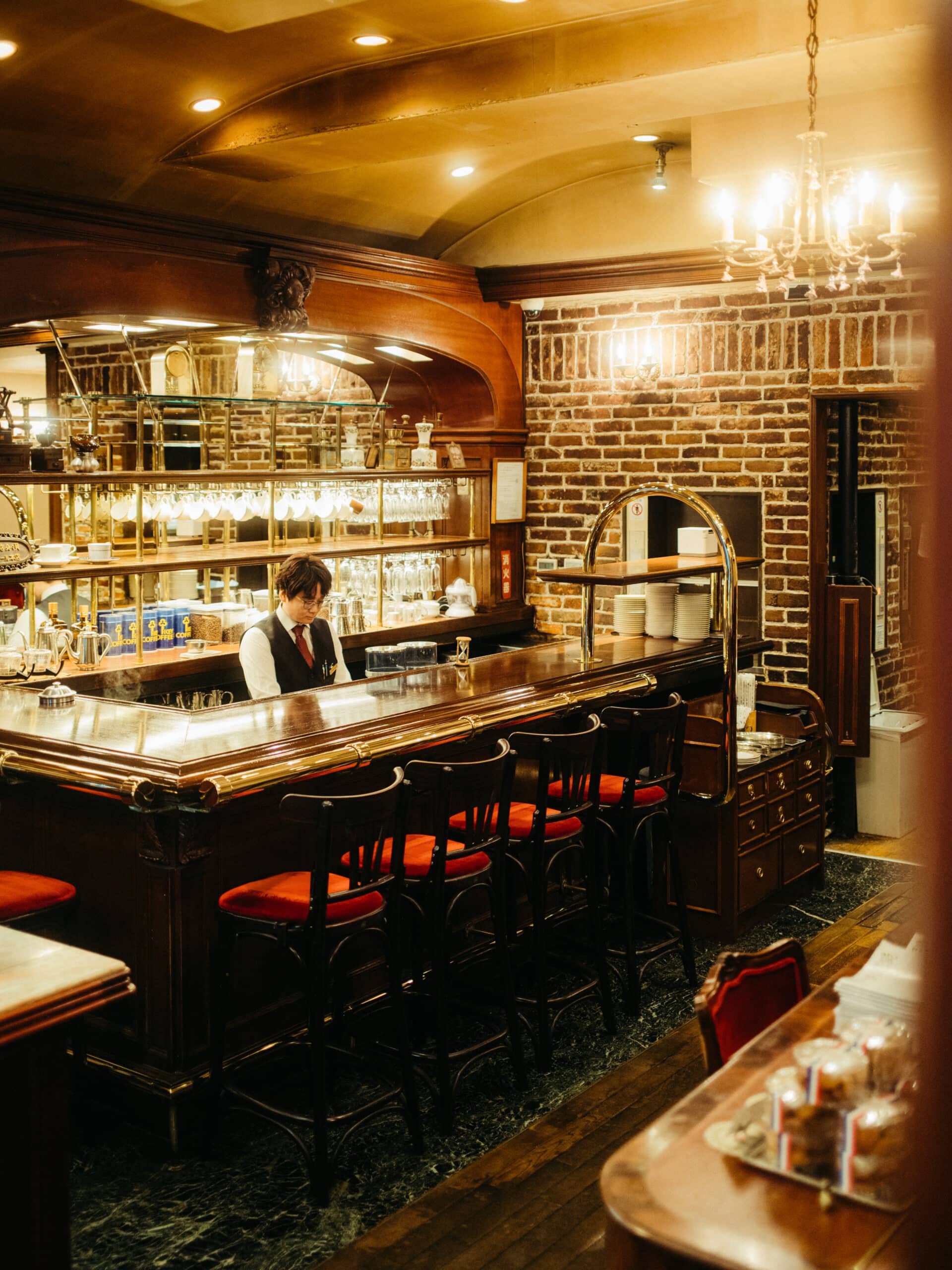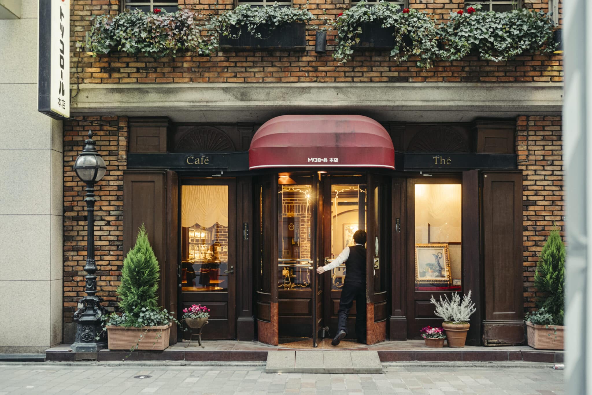 現存する最古の喫茶店は、1910年の創業から110年の時を経た銀座の『カフェ―パウリスタ』と言われています。そこから26年後の1936年にできた『トリコロール本店』は、ヨーロッパの街角を思わせるレンガ造りの外観が目を惹きます。なかでも特徴的なのは、入口です。重たい扉をぐっと押してひとりずつ入店する回転式で、あまり見かけることのない珍しいもの。戦後に一度建て直し、1982年に改装されて現在の形となったそう。