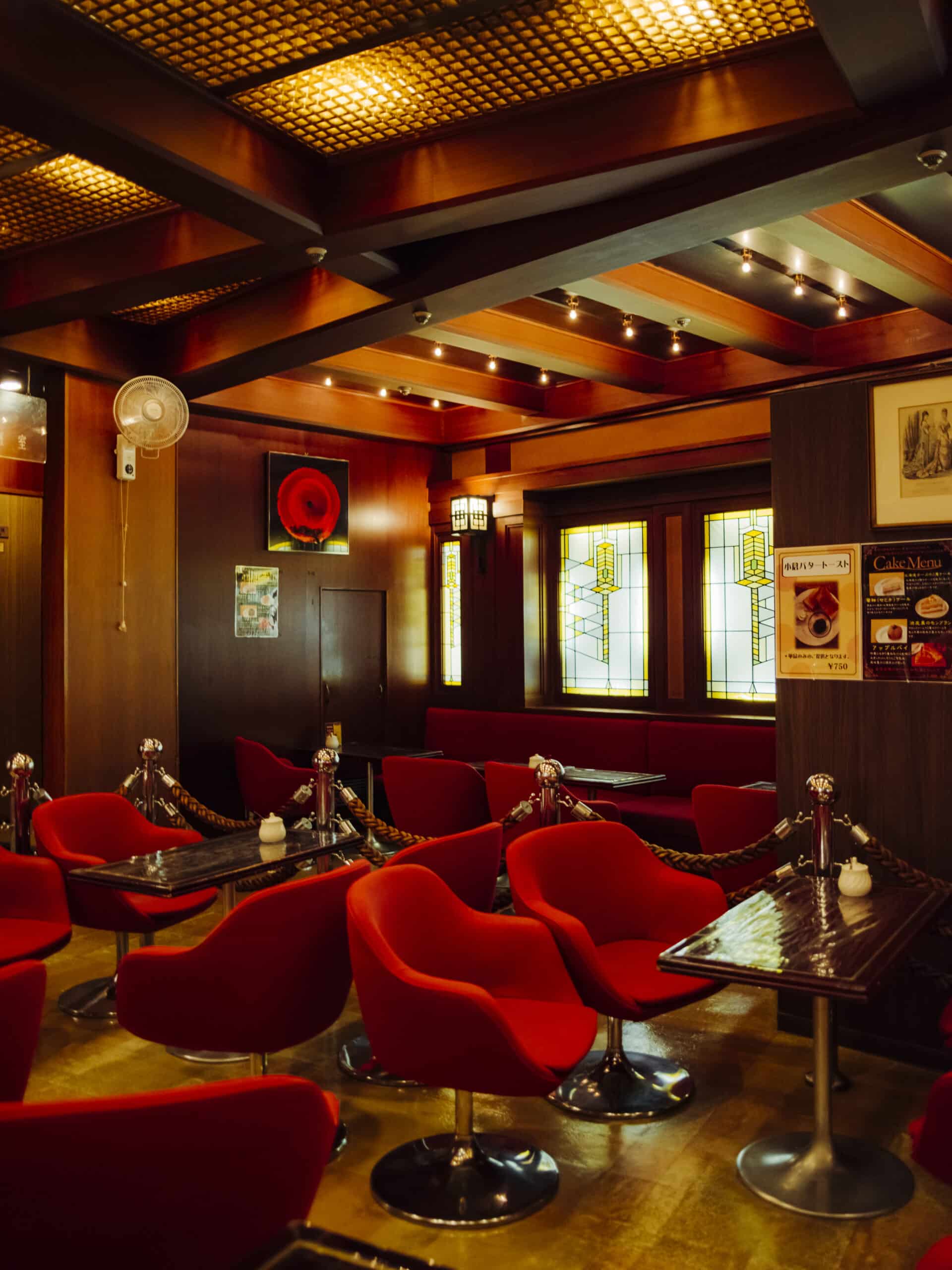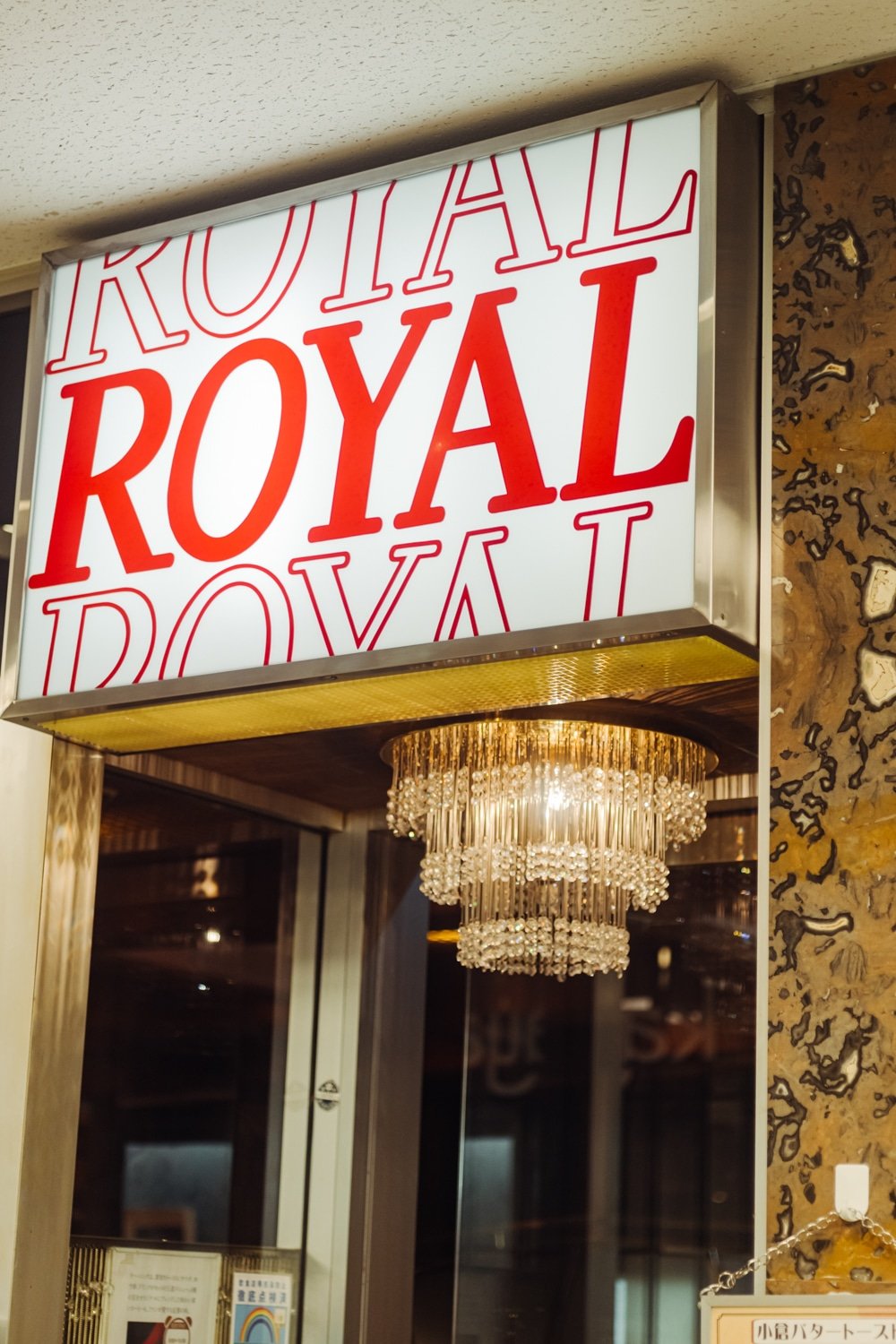 また、有楽町駅のほど近くにある『ローヤル』もたくさんの見どころがあるお店です。1965年に交通会館の設立と同時期に創業、ビル内にパスポートセンターがあることから、長らく、パスポートの発行を待つ人たちや都庁関係の人が多く訪れてきました。地下にありながら周囲を明るくする入口近くの天井にあるきらびやかな照明、店名をイメージする王冠が記されたロゴマーク、いったん足を止めて見入ってしまうサンプルケース、そして店内では、フランク・ロイド・ライトがデザインしたものを模倣したと思われる大きなステンドグラスが出迎えてくれます。