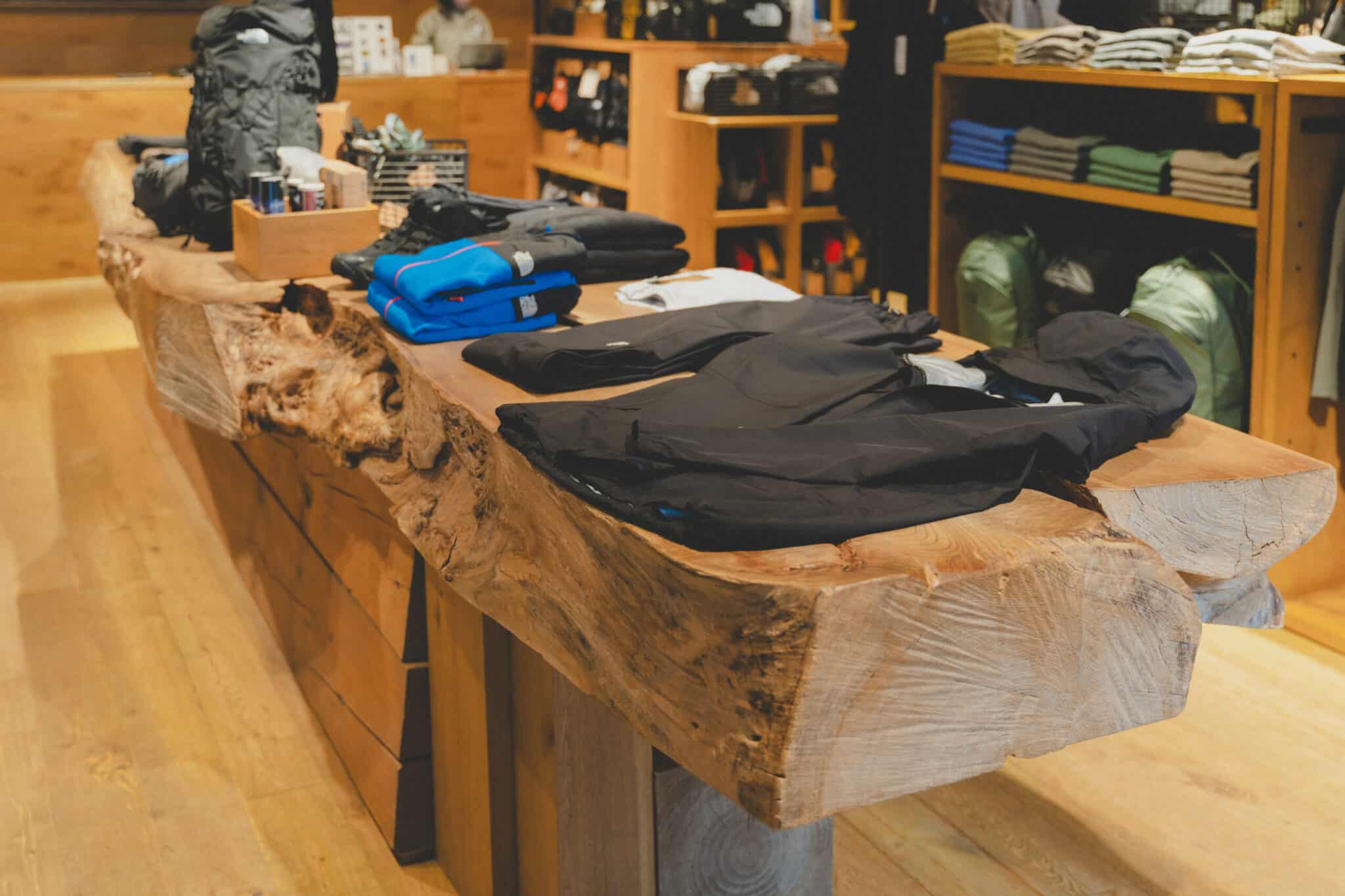 旗艦店である原宿店には、アパレルアイテムはもちろん、寝袋や、ブランドのルーツである布団に至るまで、全商品のラインナップが揃います。ダウン製品を実際に手に取り、素材感や縫製を確かめながら、ブランドの背景にある思想まで知ることができます。