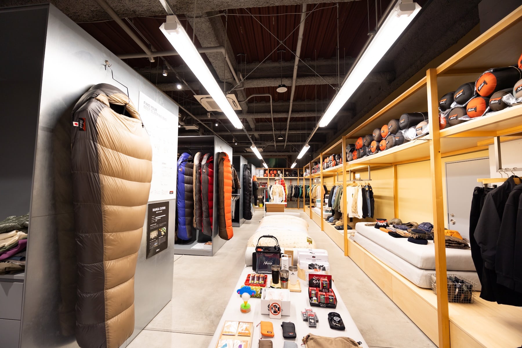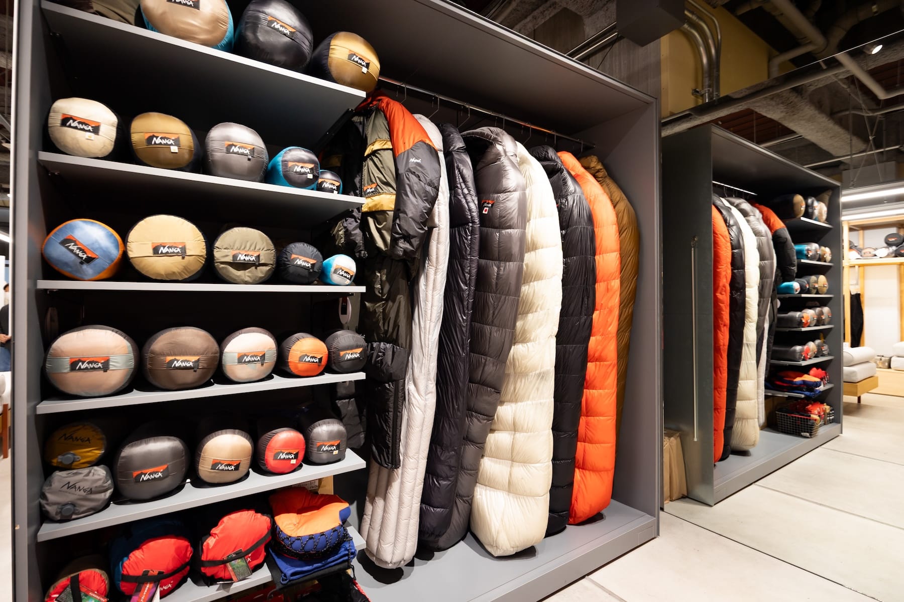 工場をイメージした『NANGA SHOP HARAJUKU』の店内には、布団づくりの技術を生かした高品質な寝袋やダウン製品がずらりと並んでいる。