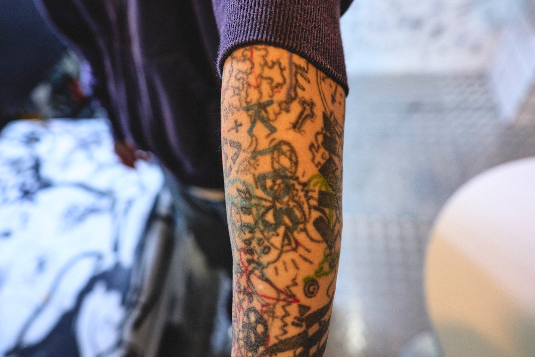 スキルアップもかねて自身に刻んできたタトゥーがびっしり。“KIDS”の文字は映画『キッズ』の監督であるラリー・クラークに書いてもらったサインをタトゥーに。ちなみにラリー・クラークにはTAPPEI氏のタトゥーが刻まれている