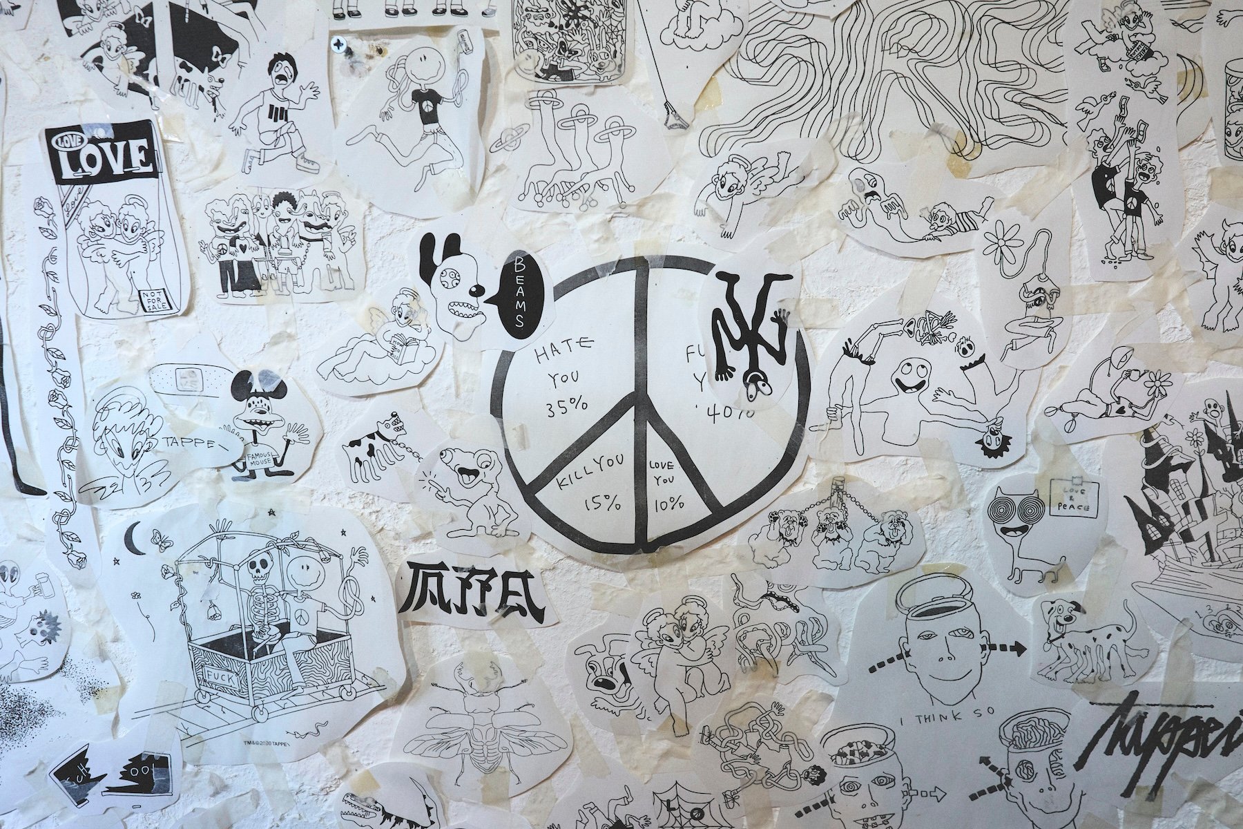 スタジオの壁にはTAPPEI氏がこれまでに刻んできたタトゥーの痕跡(フラッシュ)の一部が無数に貼られている