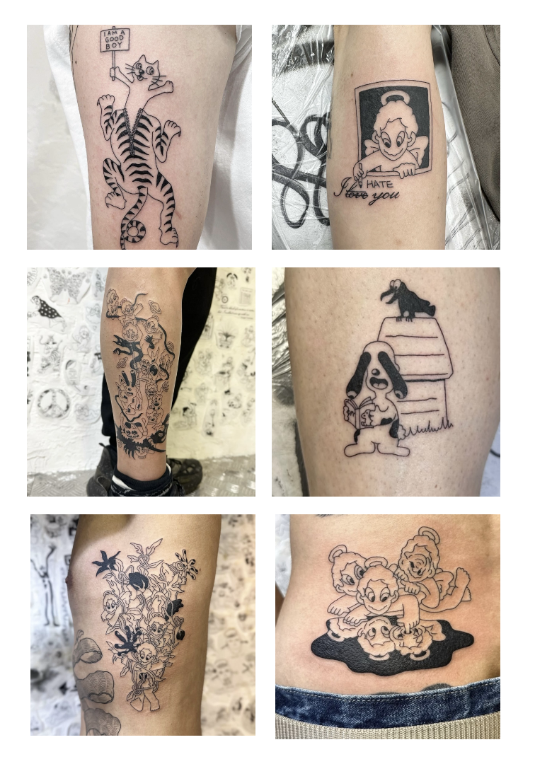 TAPPEIのタトゥー作品。これまでに施術してきた人は1万人以上。はちゃめちゃなことをしているイタズラ好きな天使たちはどこか愛らしい。