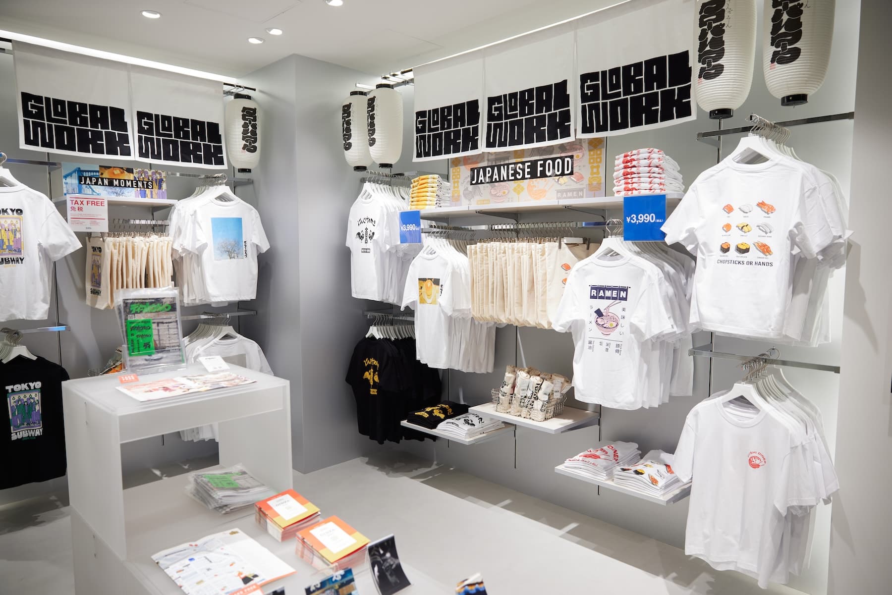 CONNECT SPACEの左手のスペースも『GLOBAL WORK GINZA』ならではの、ジャパン・コンテンツコーナー。その時期ごとに多種多様なコラボレーションが展開されていきます。取材時は、棚の上に提灯や暖簾などがディスプレイされ、お寿司などの日本食や、日本の日常や風景をデザインに落とし込んだTシャツやトートバッグがずらり。日本のリアルカルチャーを堪能できる空間が構築されていました。日本のお土産をゲットすることができるというのも銀座店ならではの特徴です。