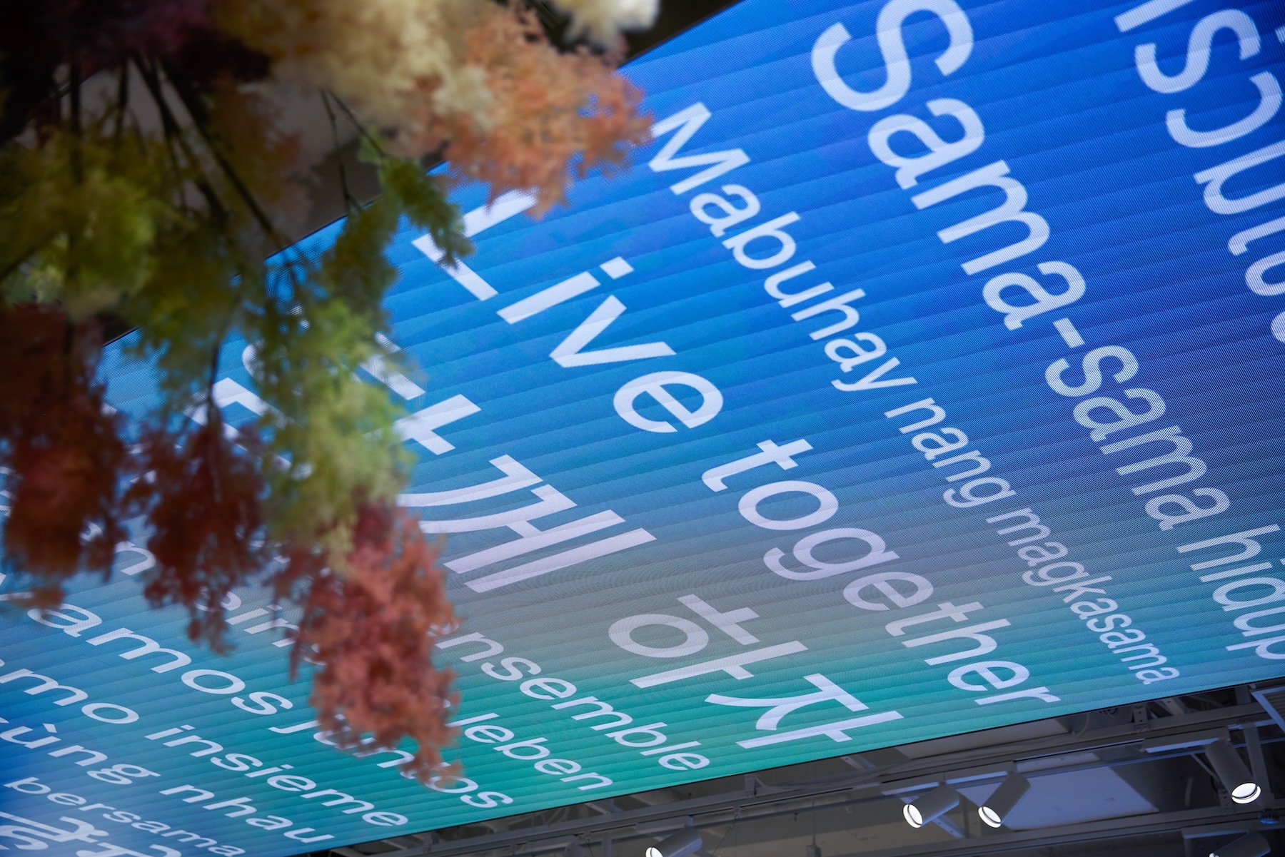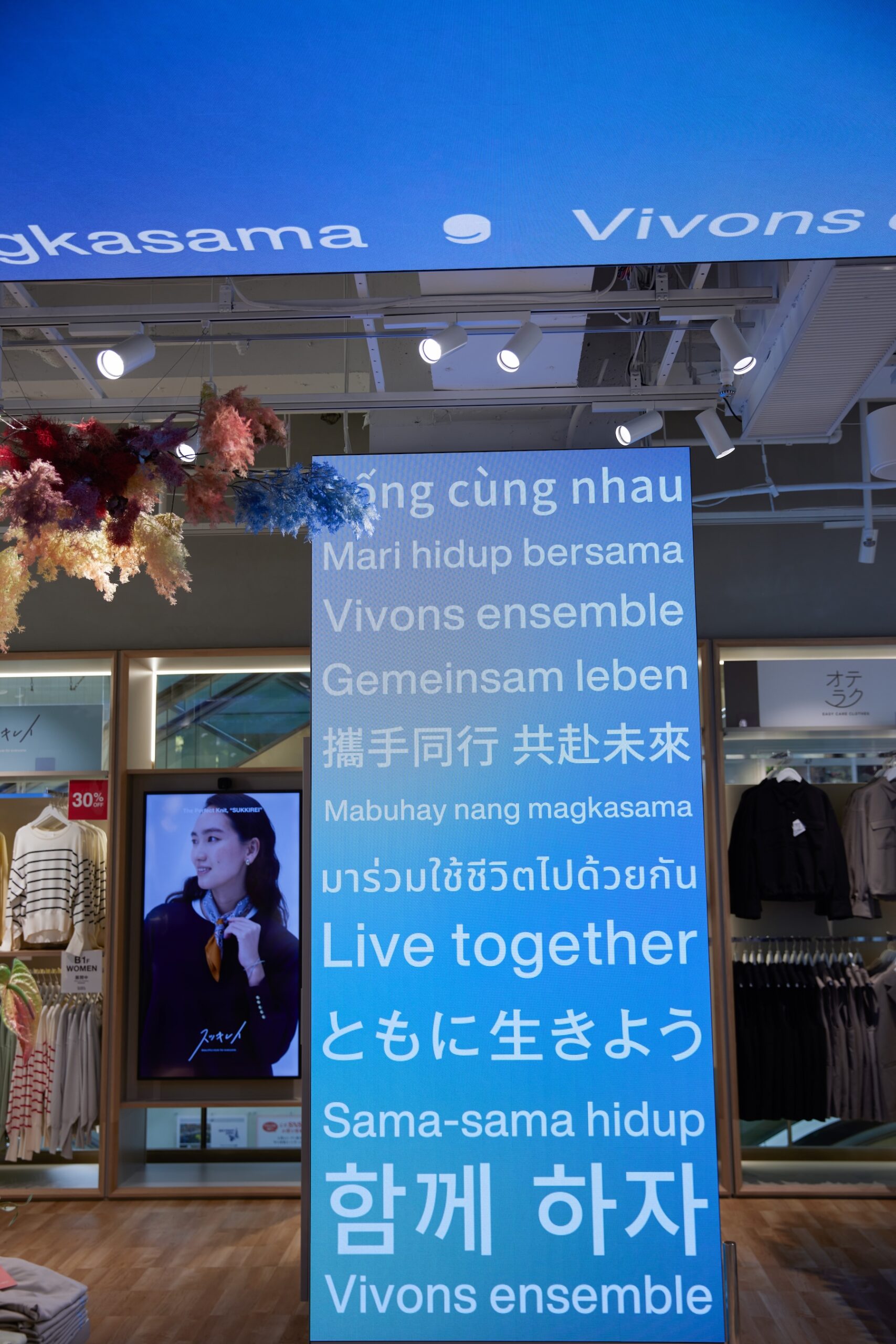 「ショップの大きな特徴は外からも見える大きなサイネージです。入り口から入ってすぐのフロアを“CONNECT SPACE(コネクトスペース)”と呼んでいるのですが、壁から天井にかけてぐるりと覆うように設置していて、世界各国の言葉でブランドのステートメントでもある“Live together”が流れているんです」(ブランドプレス・梁川辰子さん)