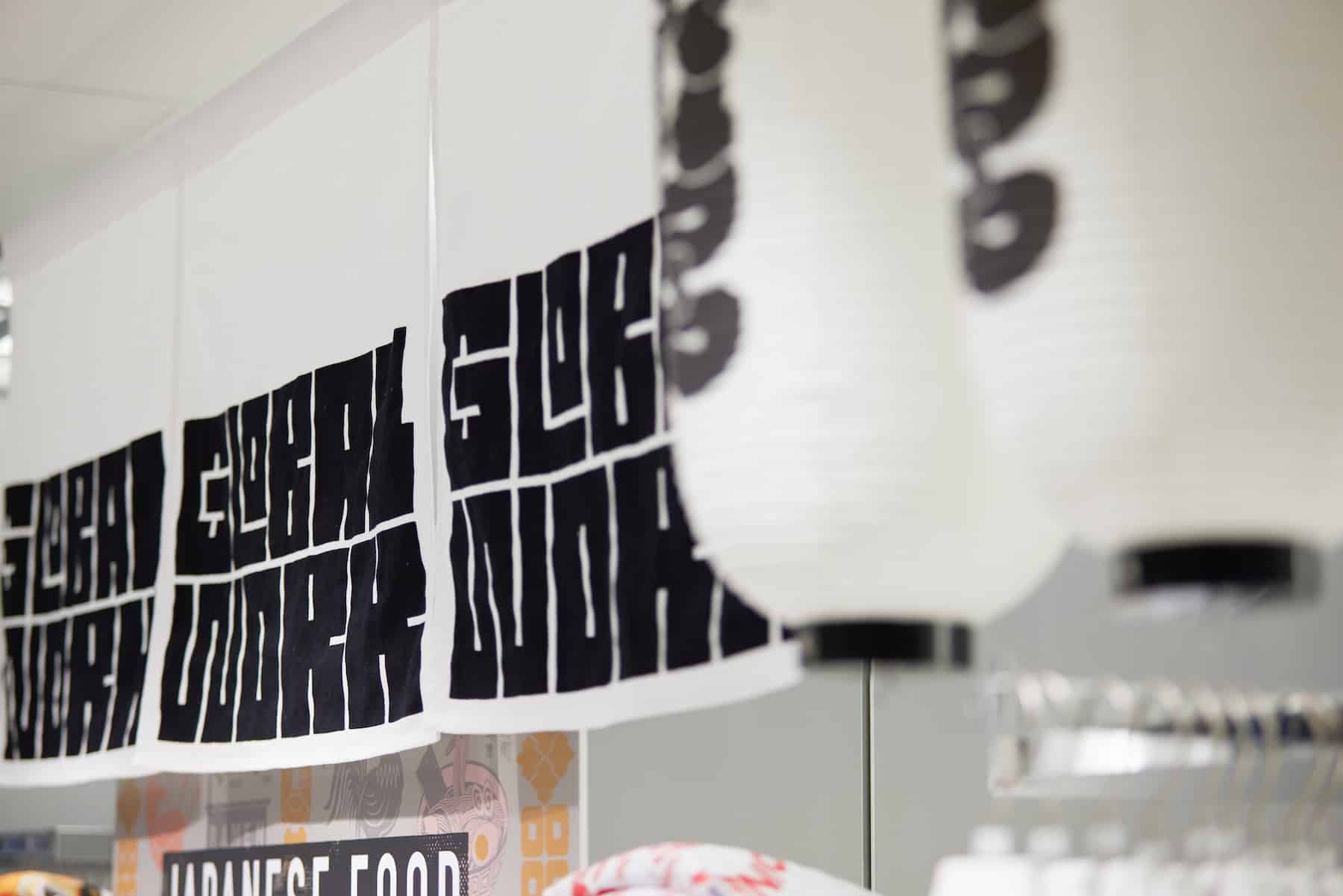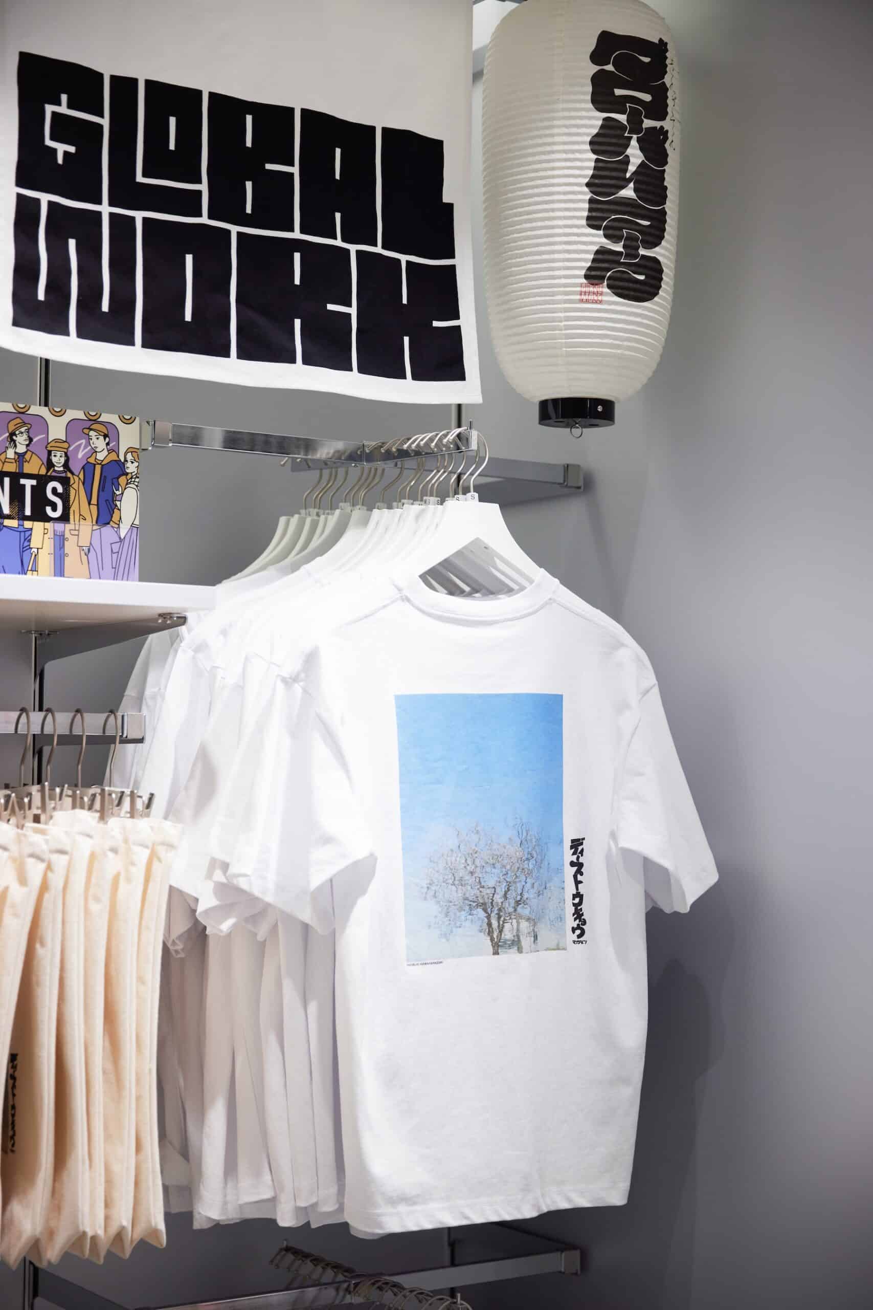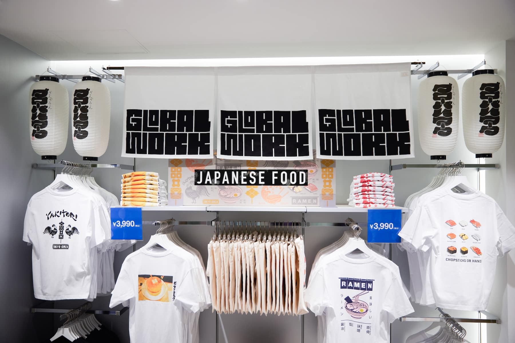 CONNECT SPACEの左手のスペースも『GLOBAL WORK GINZA』ならではの、ジャパン・コンテンツコーナー。その時期ごとに多種多様なコラボレーションが展開されていきます。取材時は、棚の上に提灯や暖簾などがディスプレイされ、お寿司などの日本食や、日本の日常や風景をデザインに落とし込んだTシャツやトートバッグがずらり。日本のリアルカルチャーを堪能できる空間が構築されていました。日本のお土産をゲットすることができるというのも銀座店ならではの特徴です。